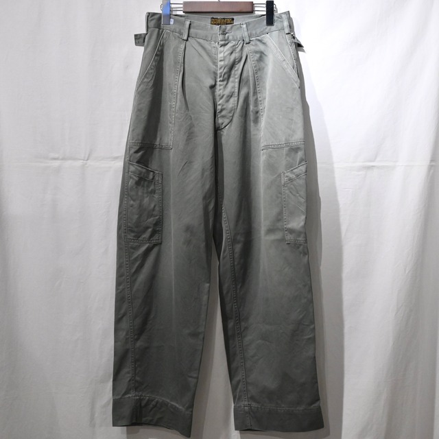 1950年代、アメリカ軍のメカニックパンツです。 素材:コットン サイズ:表記サイズ30R 実寸 ウエスト:78cm 股上:33cm 股下:75.5cm ワタリ幅:36cm 裾幅:25cm 状態:細かな汚れはございますが、全体的に良好なコンディションです。画像にてご確認ください。 セージグリーンとタック入りの太めのシルエットが特徴的なパンツです。フロントのパッチポケットやサイドアジャスターなどのディティールも魅力的です。 フロントはボタンフライで、樹脂製のボタンが使用されています。2箇所ボタンが交換されています。