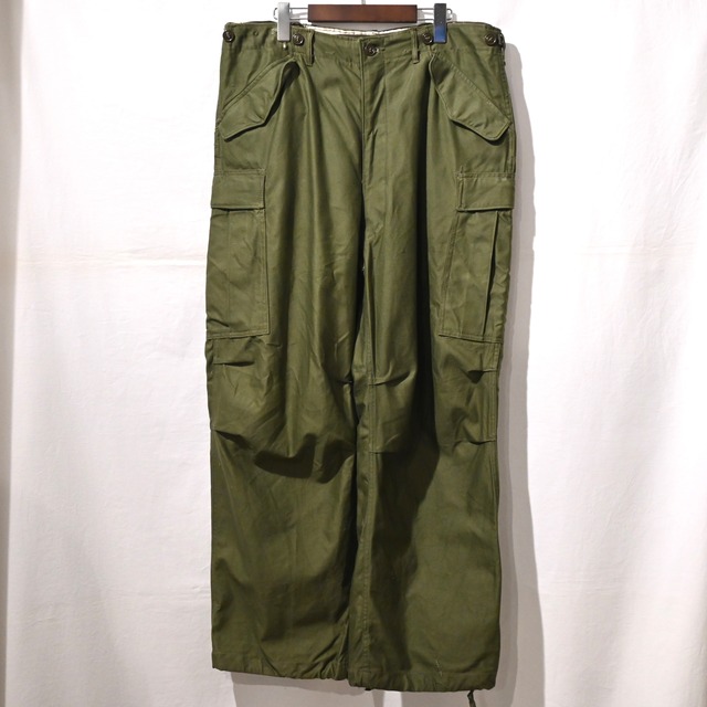 1950年代、アメリカ軍のM51トラウザーのデッドストックです。 素材:コットン サイズ:表記サイズMedium-Regular 実寸 ウエスト:最大97cm(サイドアジャスターにて調節可能です。) 股上:36.5cm 股下:73cm ワタリ幅:37.5cm 裾幅:27cm 状態:デッドストックですが、保管時の汚れ・ダメージが数箇所ございます。画像にてご確認ください。 ミリタリーアイテムの中でもかなり太めのシルエットのパンツです。迫力のあるアイテムで、シャツやスウェットなどシンプルなアイテムとの相性は抜群です。 フロントはタロンのプラスジッパーが使用されています。 ナイロンとコットンの混紡であるM65とは違いコットン100%ですので、使用によるあたりなどが出やすく経年変化もお楽しみいただけます。