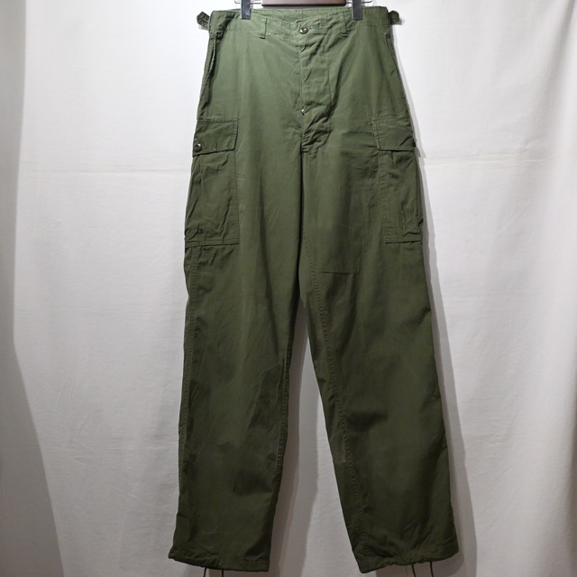 アメリカ軍のジャングルファティーグパンツの1stです。 素材:コットン サイズ:表記サイズSmall-Long 実寸 ウエスト:77cm(サイドアジャスターにて調節可能です。) 股上:36.5cm 股下:83.5cm ワタリ幅:33cm 裾幅:23cm 状態:色はしっかりと残っているコンディションですが、アタリ、薄いシミ汚れ、リペアが1箇所ございます。画像にてご確認ください。 ボタンがむき出しになっている希少な1stタイプです。ノンリップのコットンポプリン生地です。 フロントはボタンフライになっており、ボタンはツヤありのタイプです。 サイドのアジャスターや、裾のドローコードでサイズ感は若干調整可能です。