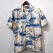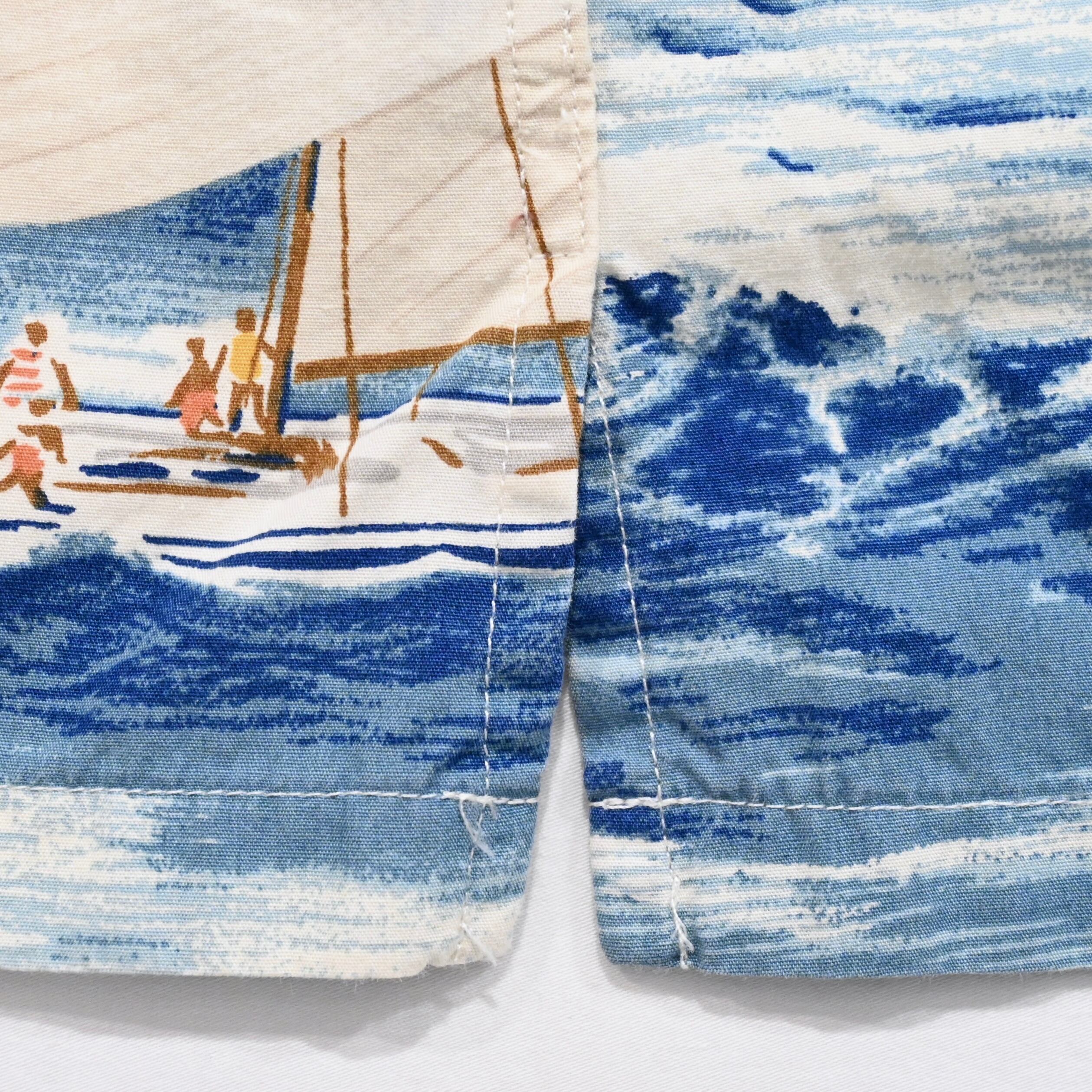 数の少ないイラストの総柄で、夏らしさのあるヨット柄です。木製のボタンが使用されており、襟もイタリアンカラーのような軽やかさが魅力です。