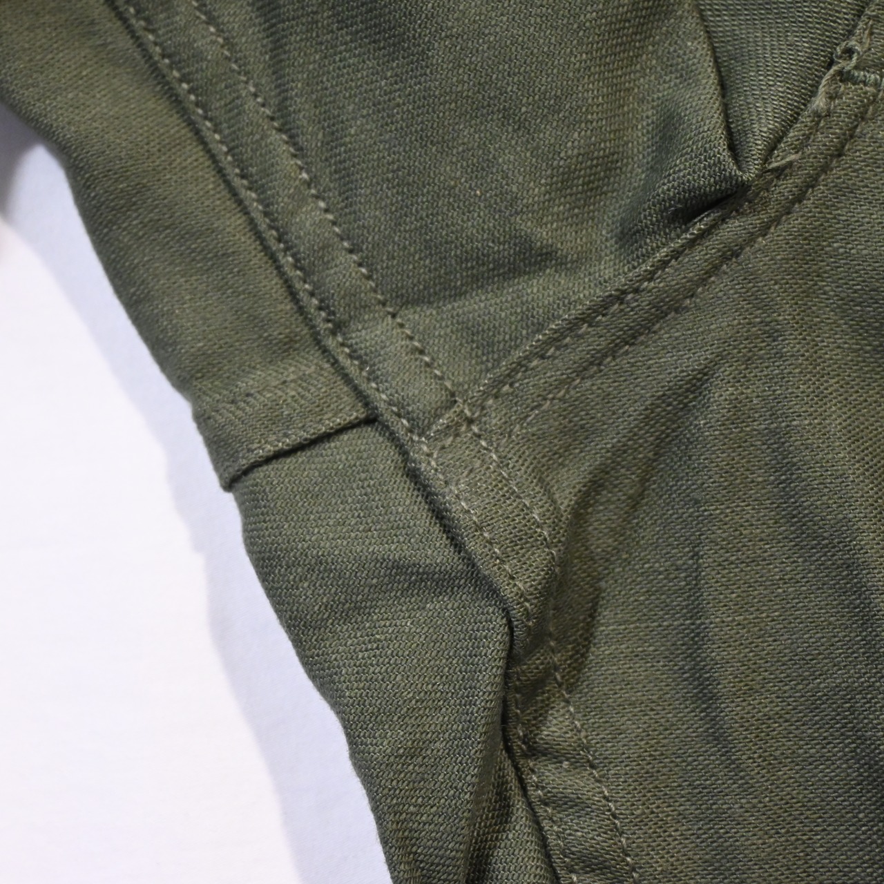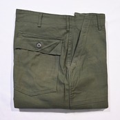 コットンサテンの柔らかい生地感で、季節を問わず着用していただけるミリタリーパンツです。カーゴポケットのないシンプルな作りでカラーがオリーブドラブである点が魅力です。