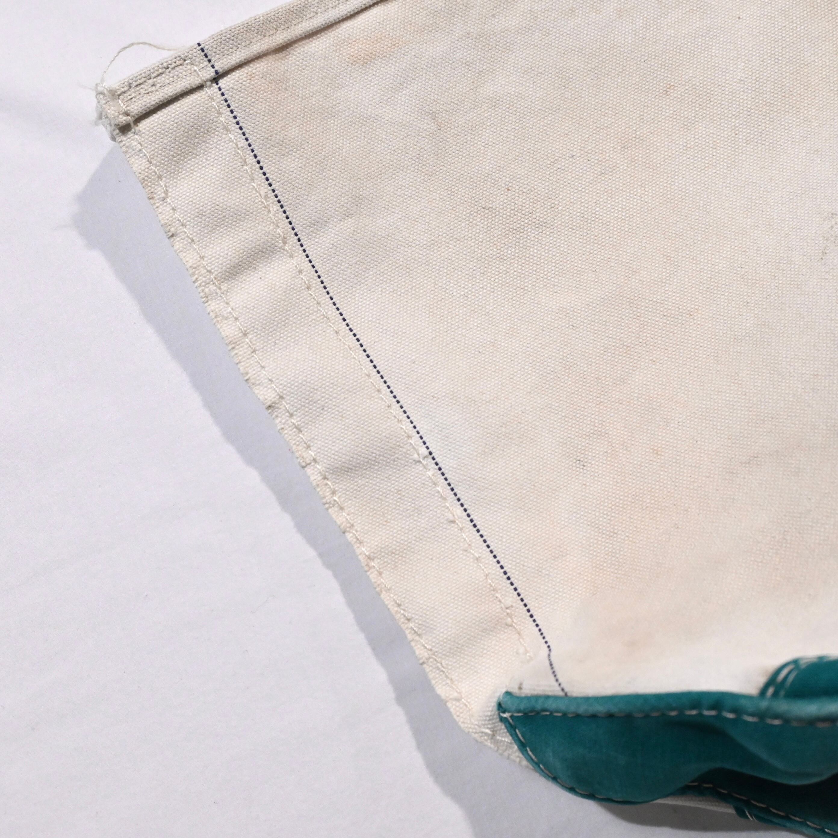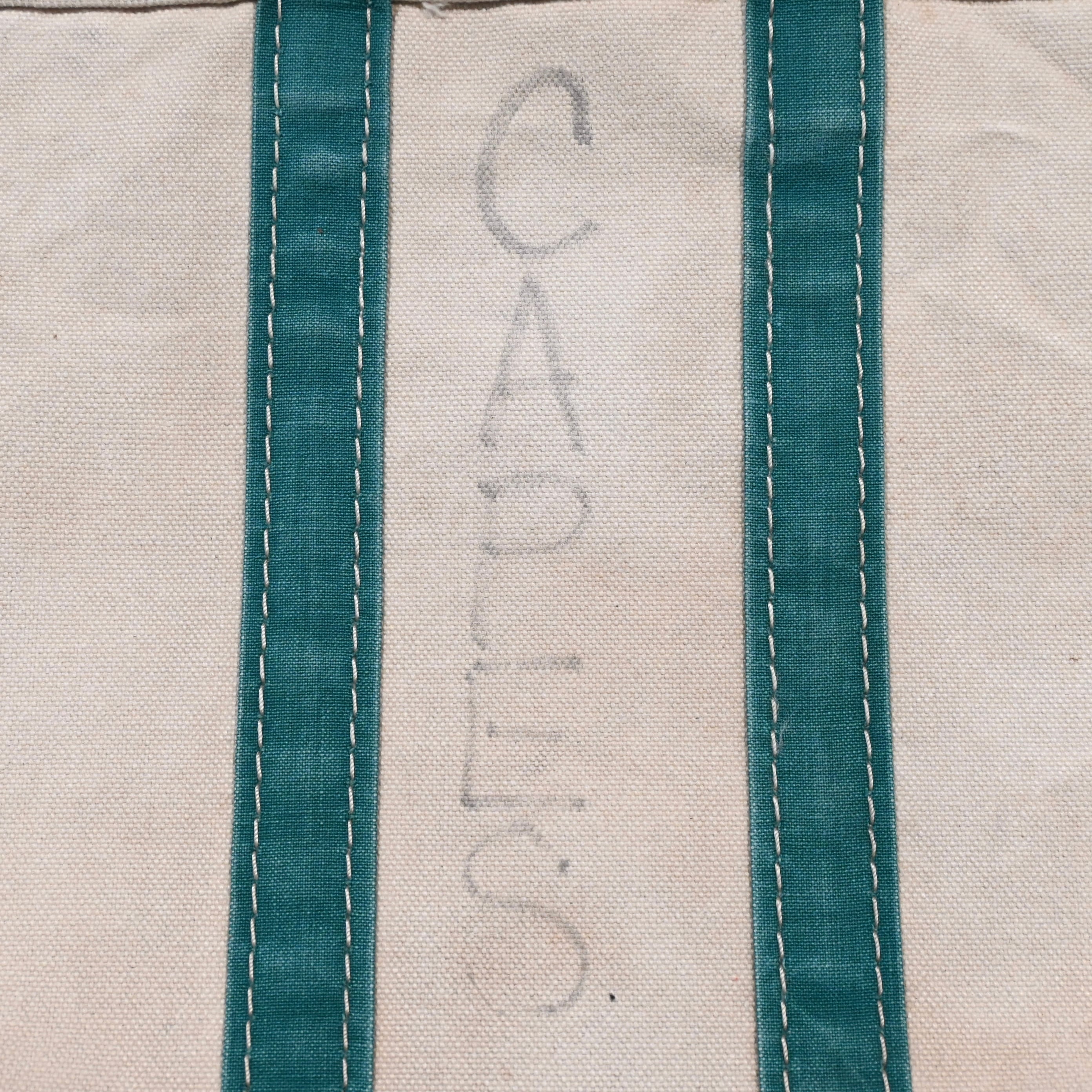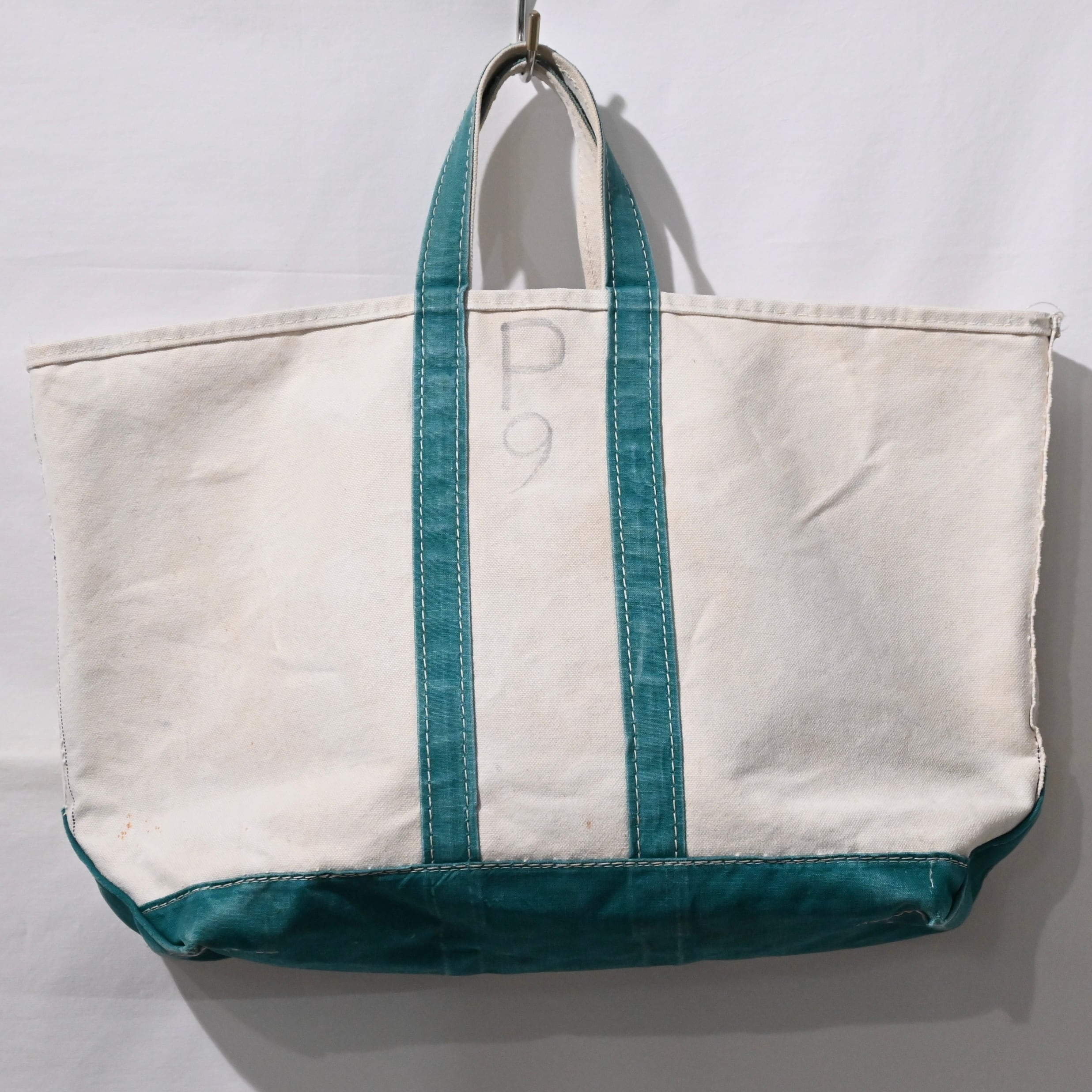 ハンドルの幅が狭く、ガイドライン付きで2トーンのタグのつく80年代のビーントートです。