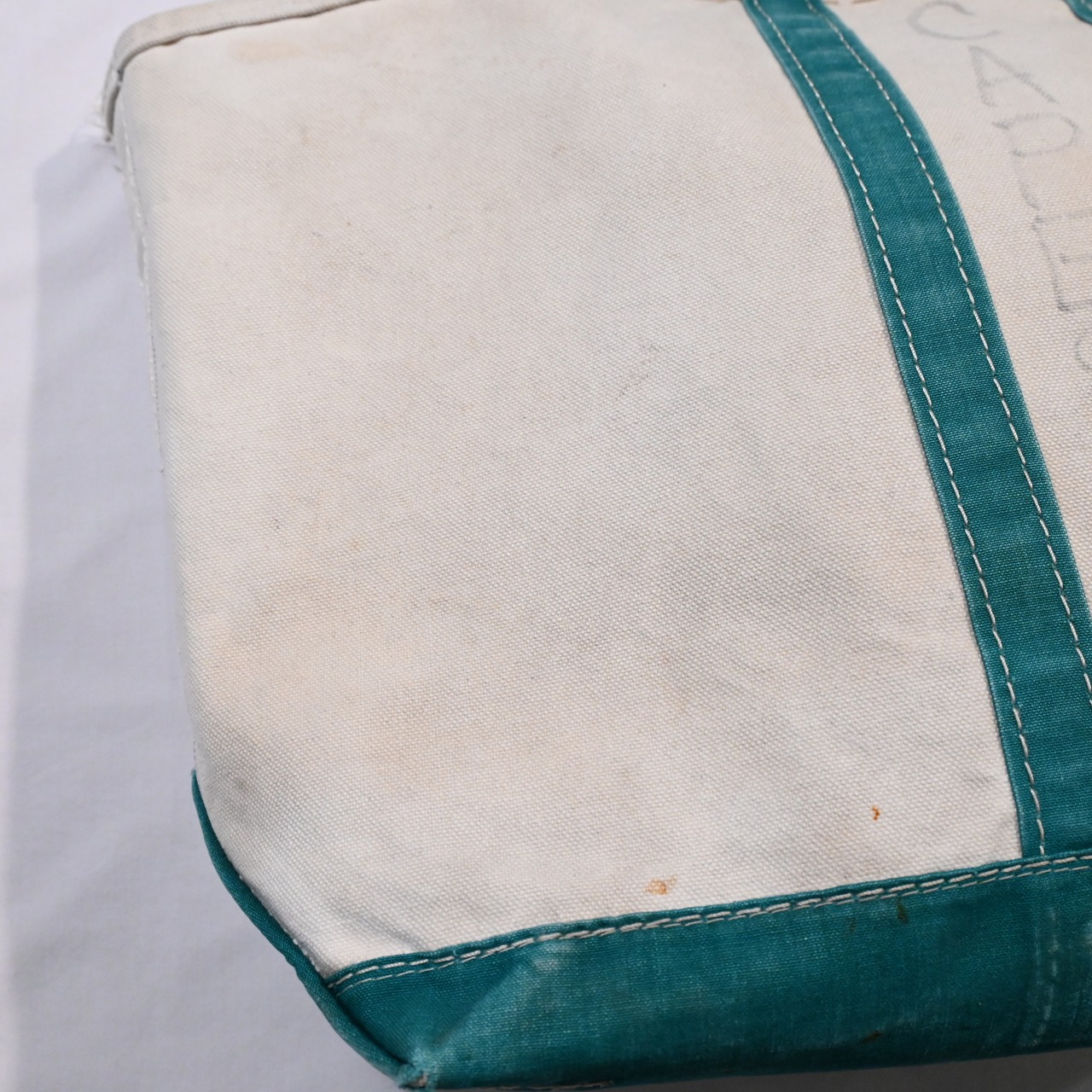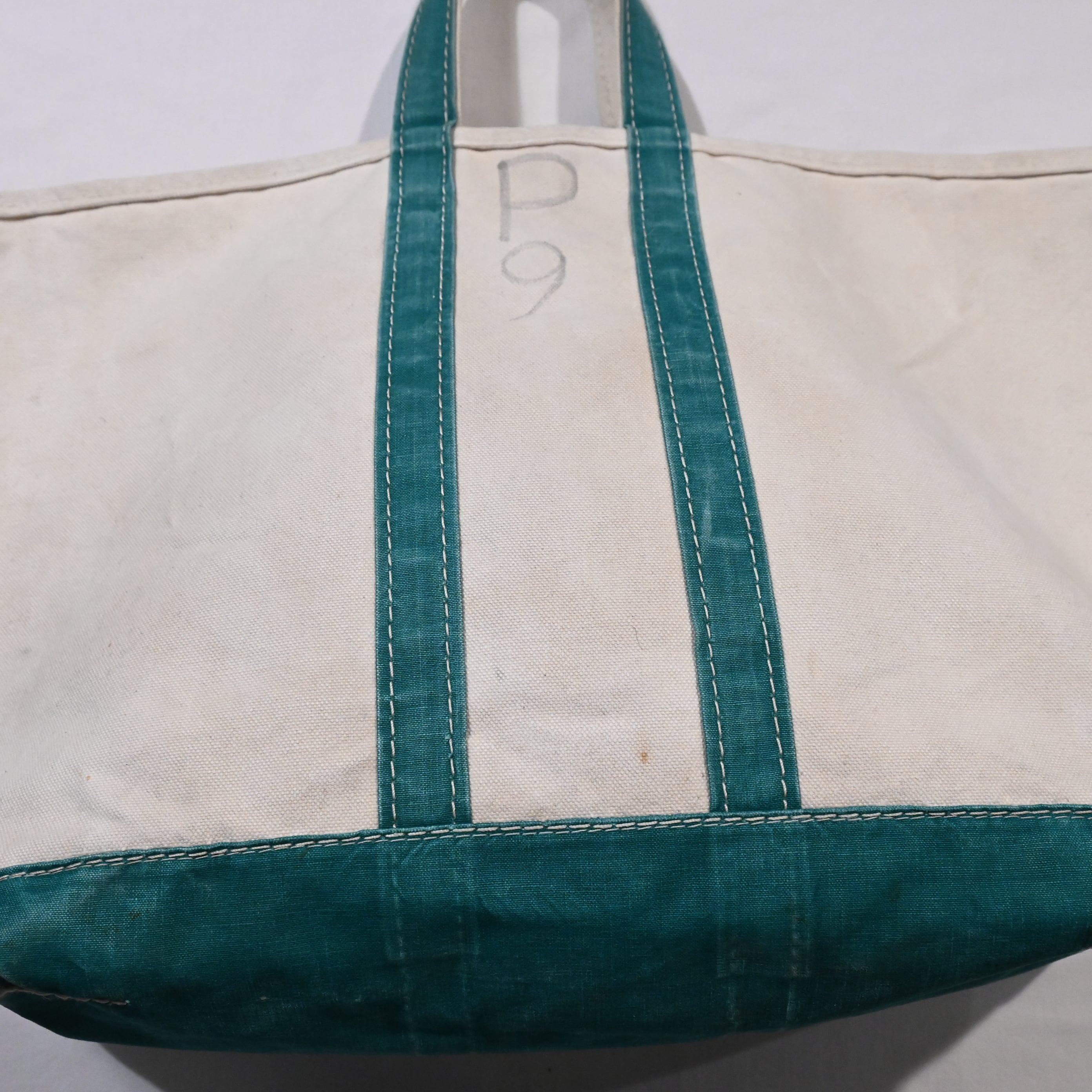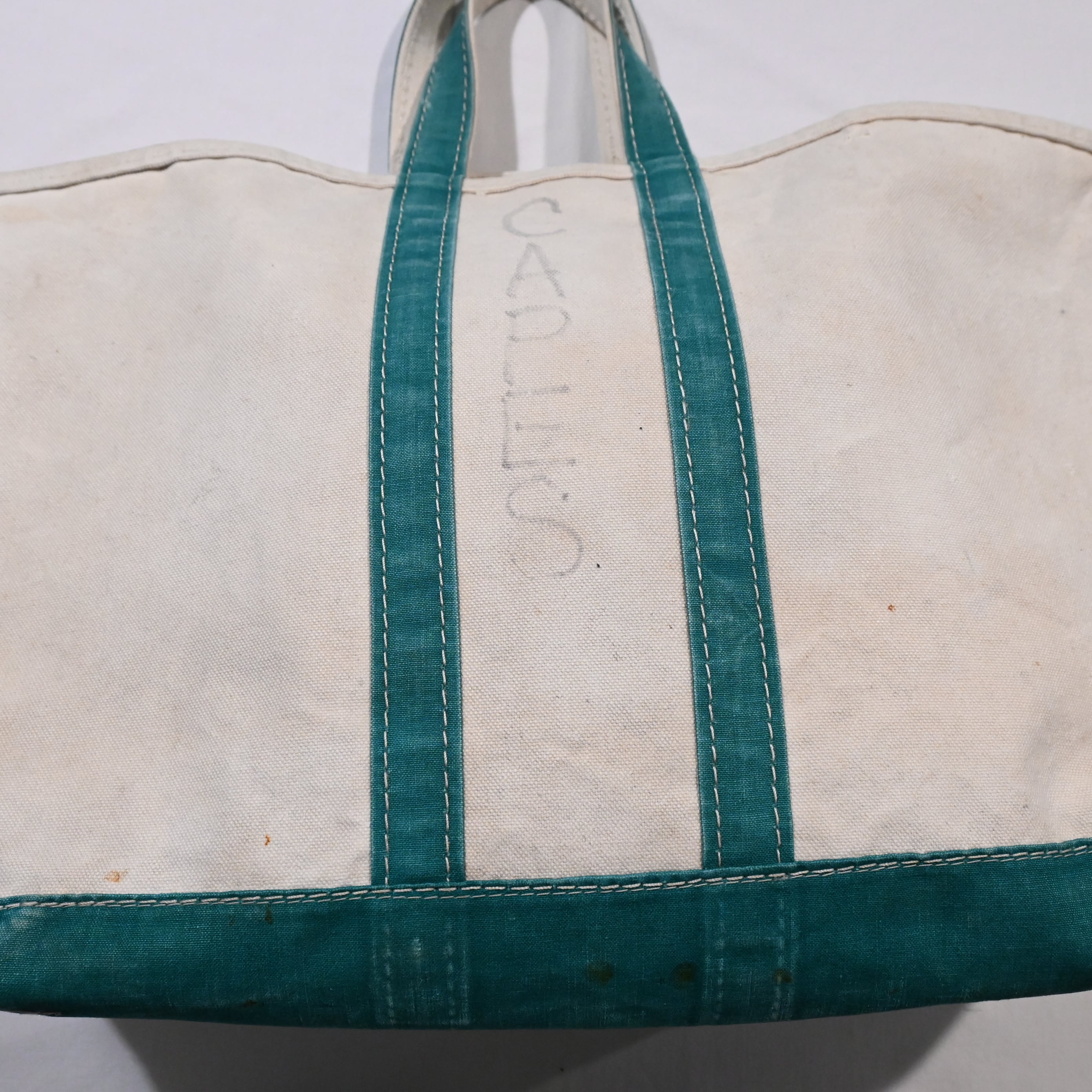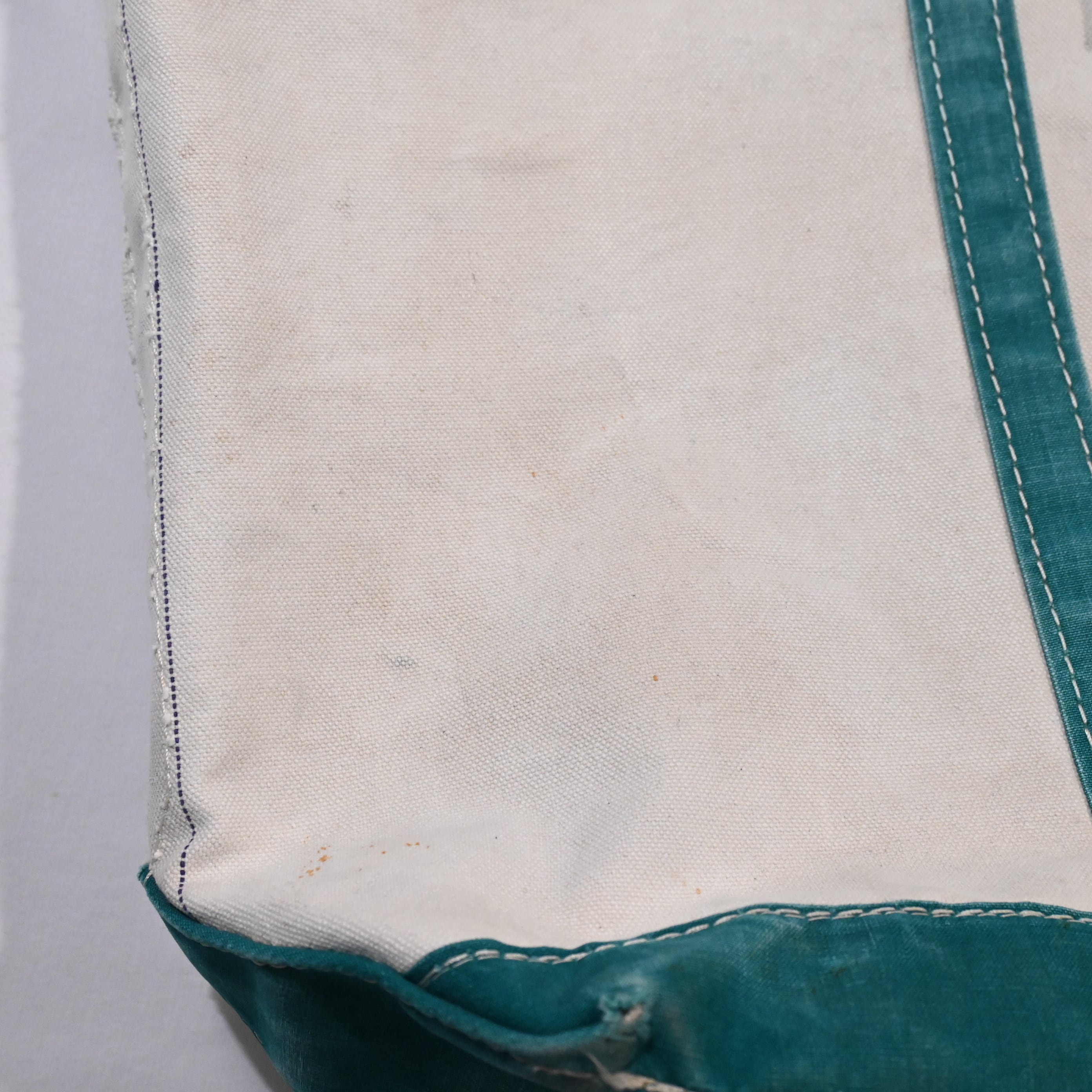 ハンドルの幅が狭く、ガイドライン付きで2トーンのタグのつく80年代のビーントートです。