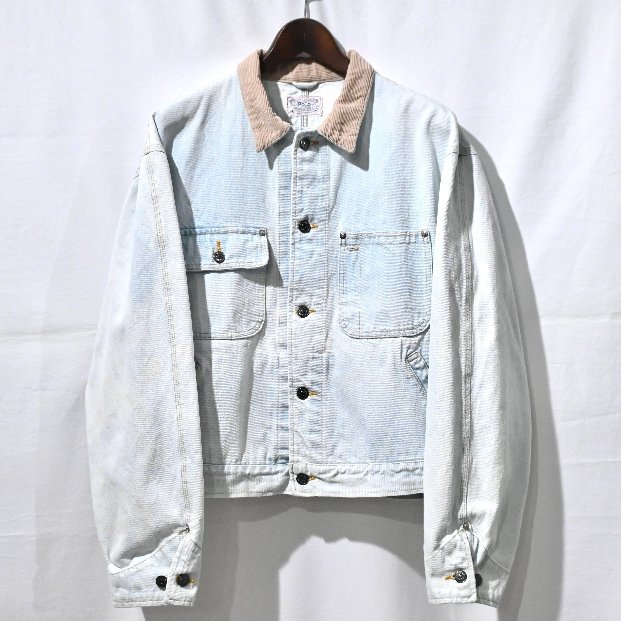 かなり明るめのペールトーンのブルーに色落ちした個体で、襟はコーデュロイと切り替えになっています。