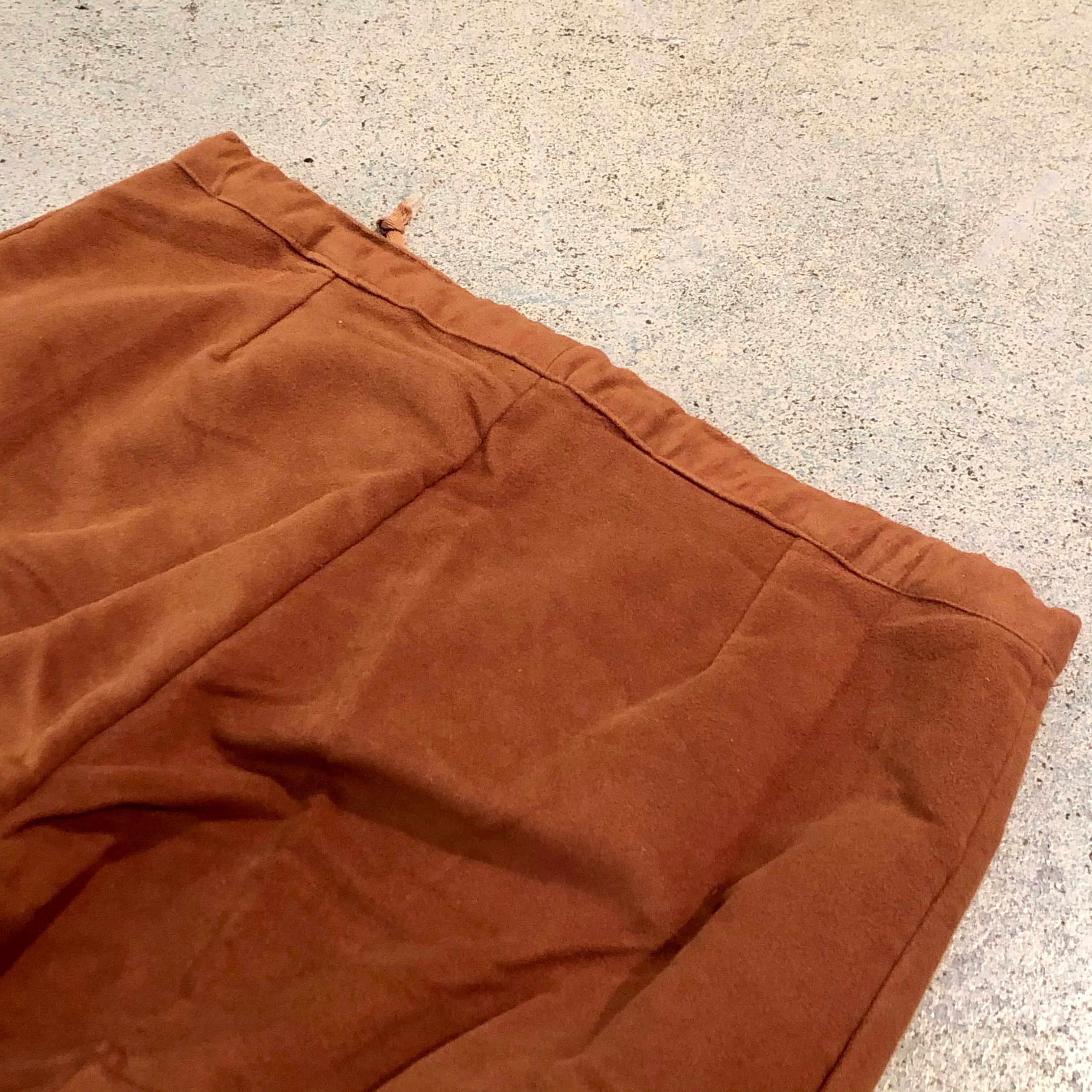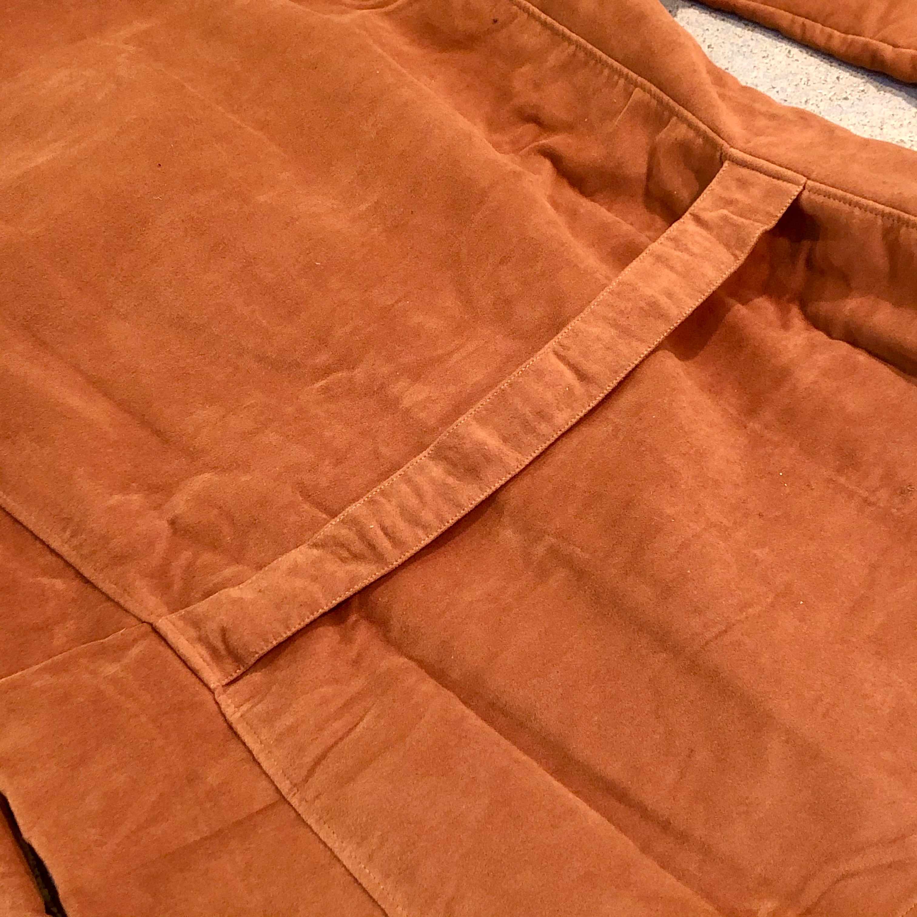 肩から裾にかけてのAラインのシルエットと綺麗なオレンジブラウンのカラーが特徴的で、起毛感のある柔らかな素材感で肌触りがかなり良いです。