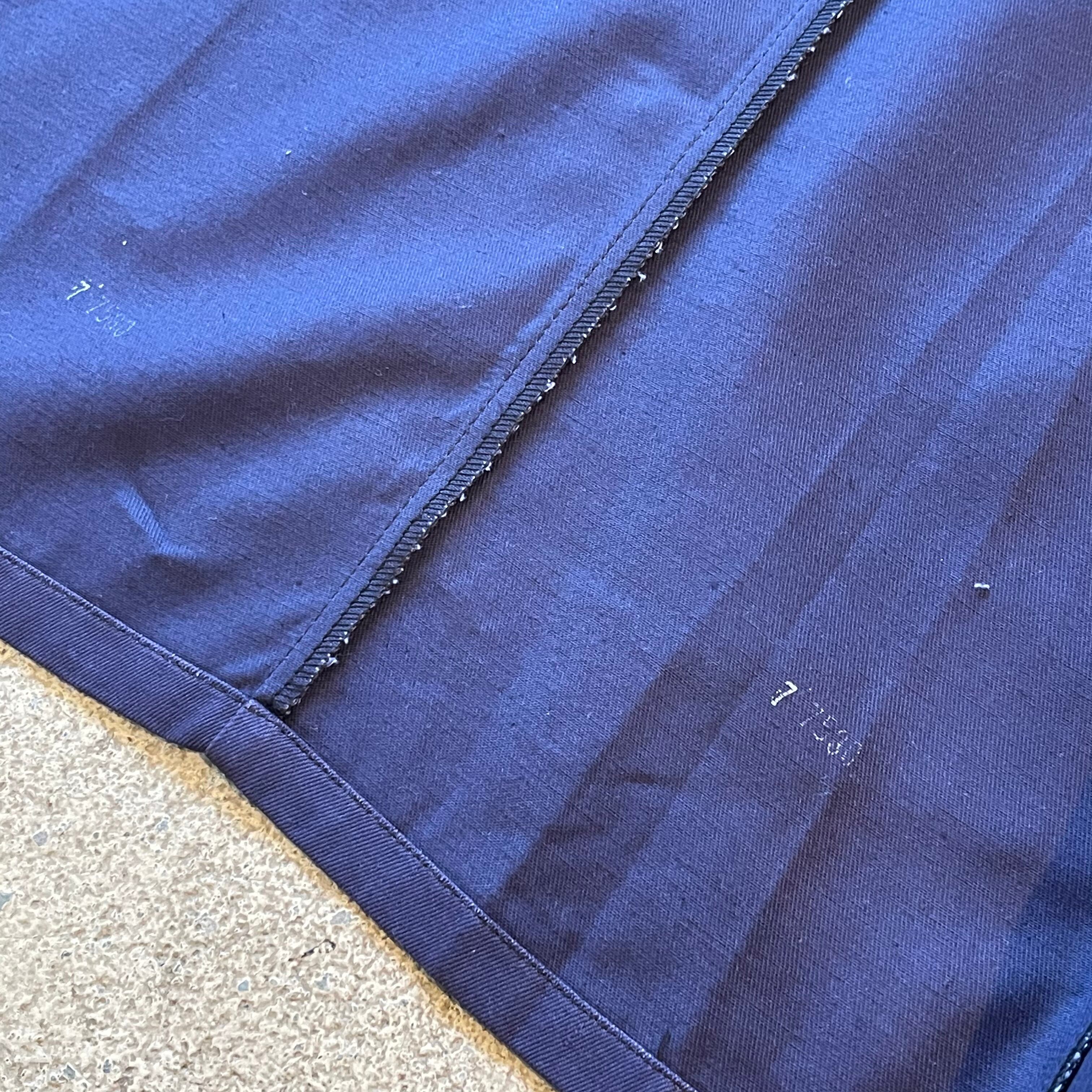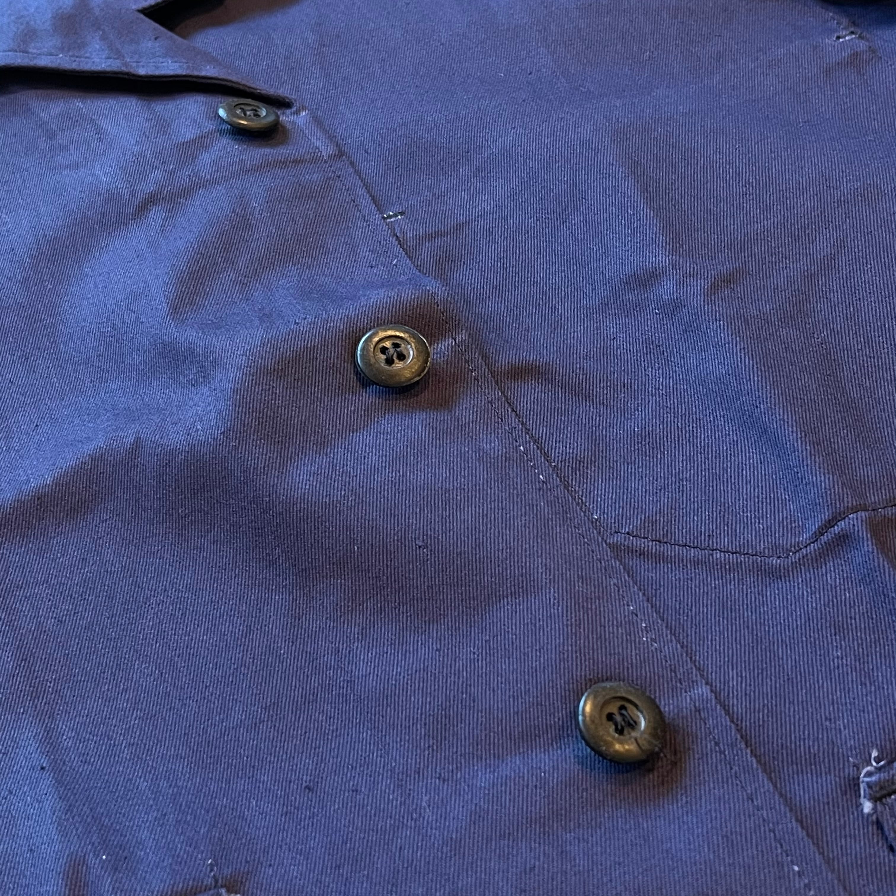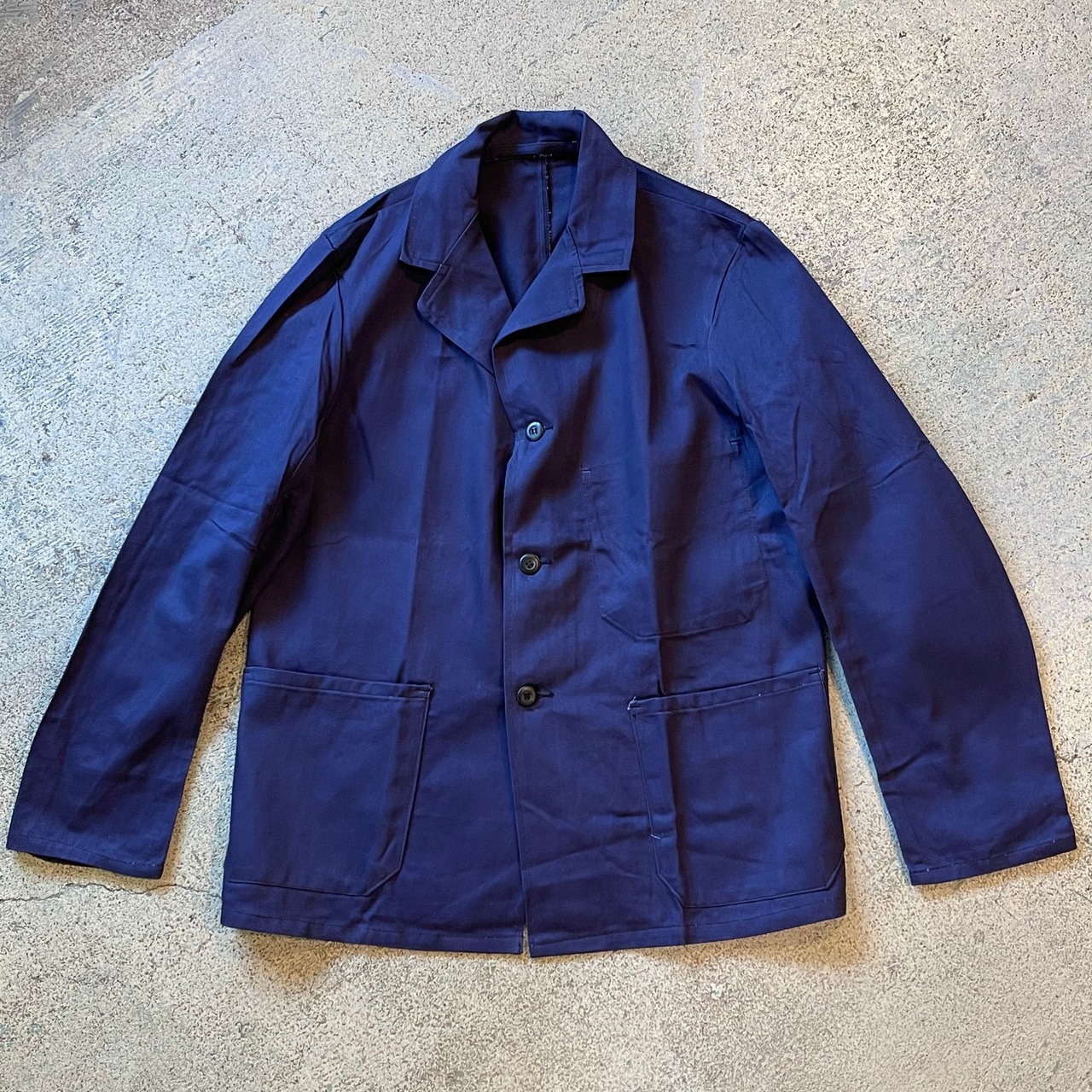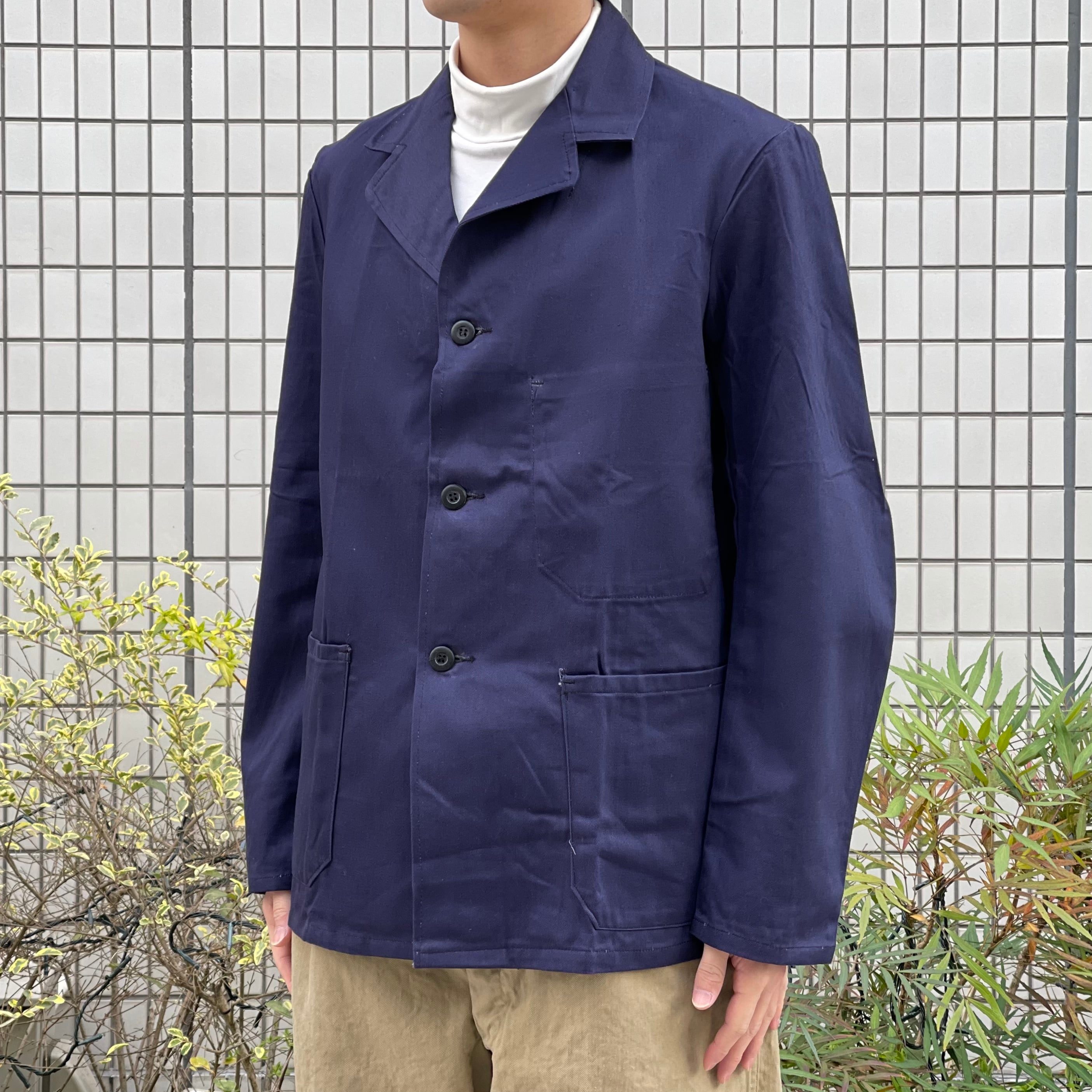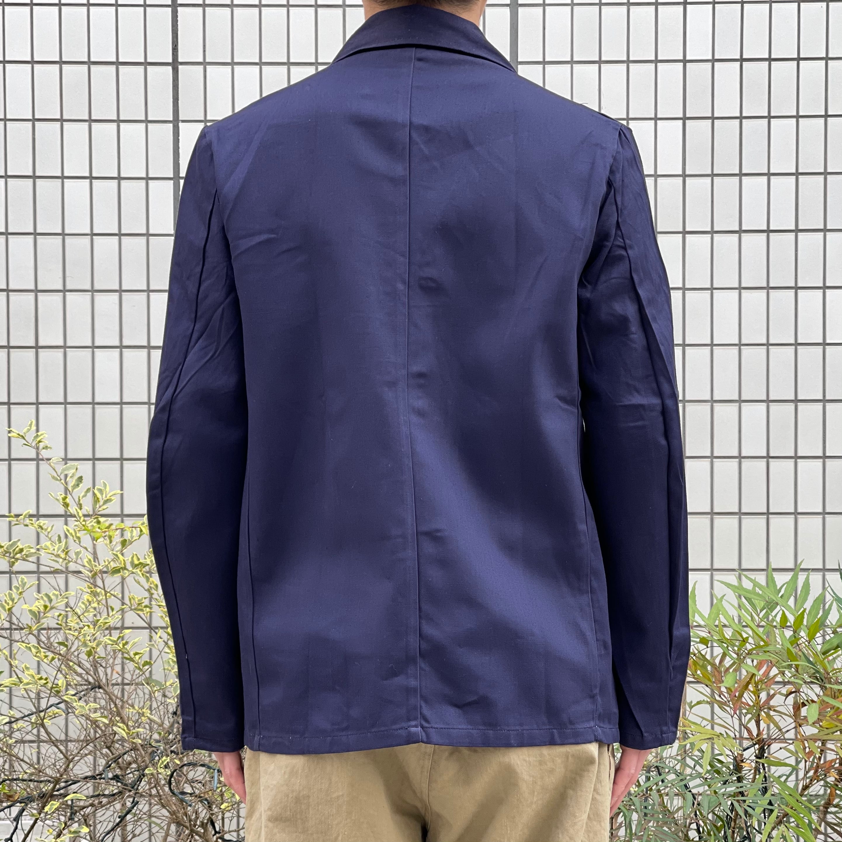 やや紫がかったネイビーのカラーに、薄手でありながら目の詰まったワーク感のある生地です。少し前傾な袖とラペルのデザインがイギリスらしく秀逸です。