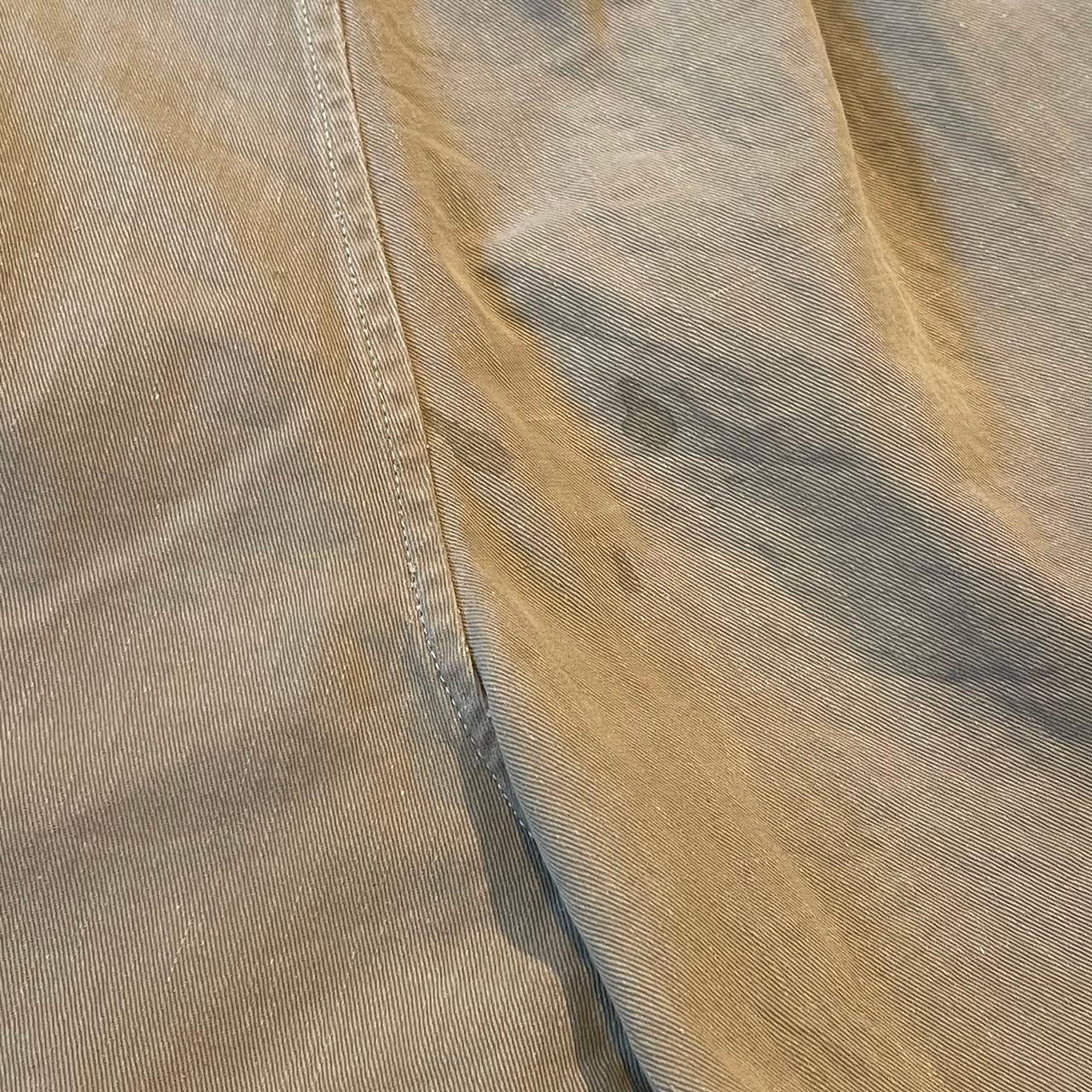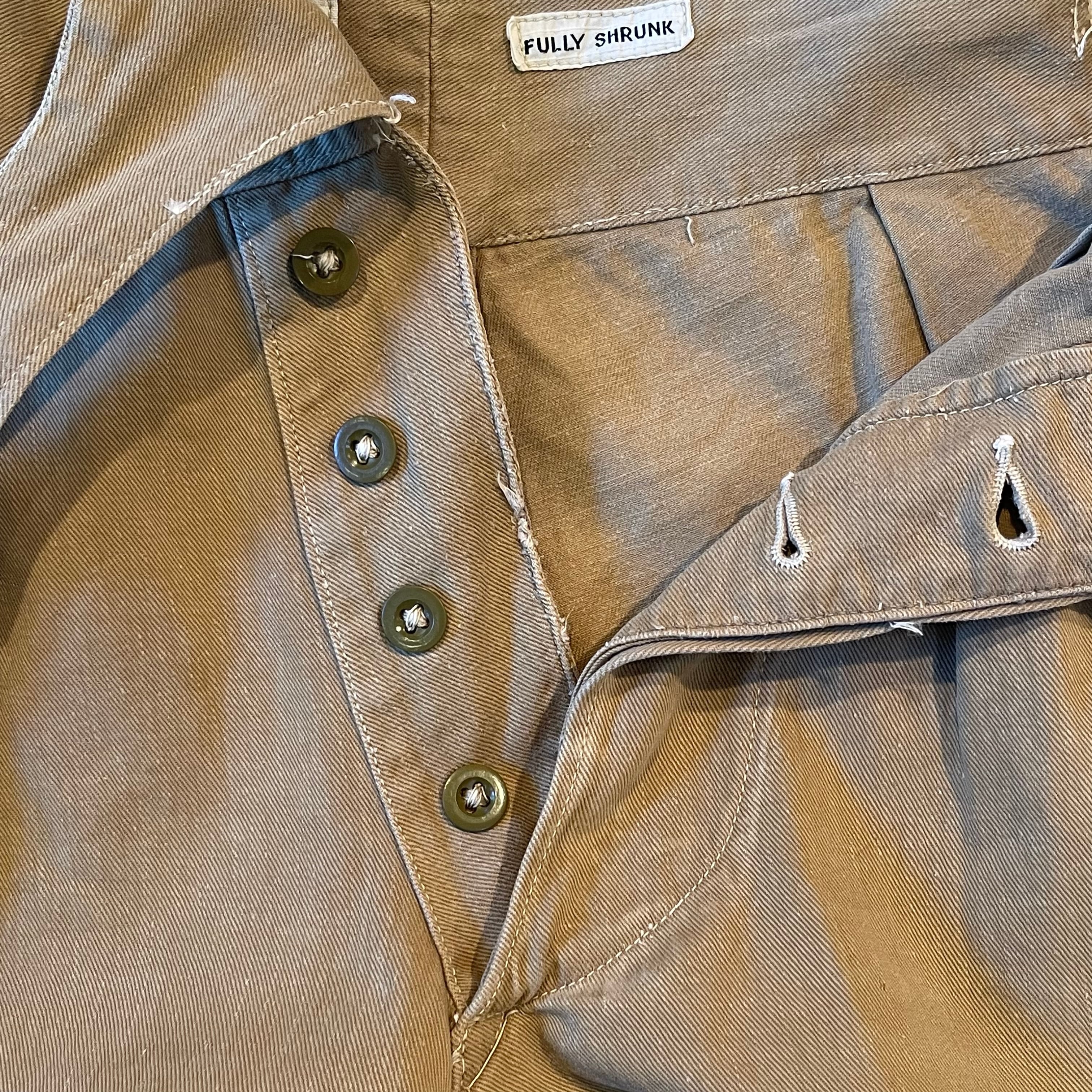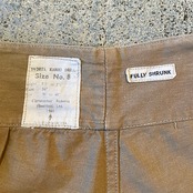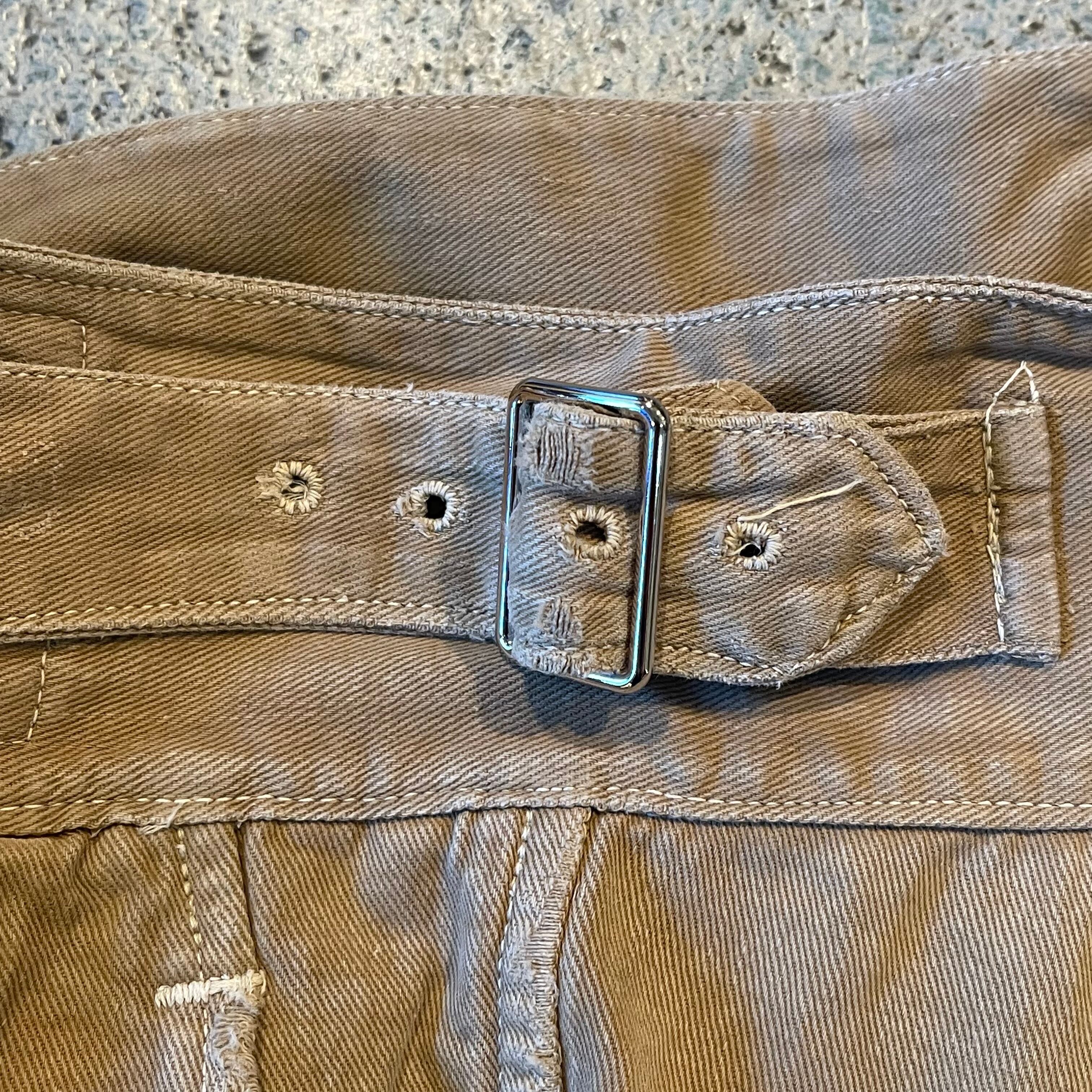 しっとりとしたコットンドリル地で、股上が深く裾が広がったデザイン、ウエストバンドにツータックのディティールは年代を感じさせないほど秀逸です。