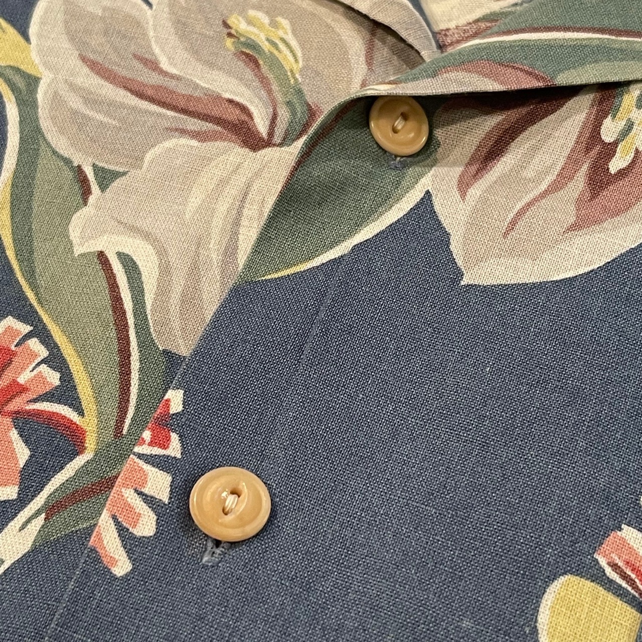 ラルフローレンならではの淡く落ち着いた、上品な色使いで、かなり雰囲気のある総柄です。ヴィンテージのボタンを意識したボタンでこだわりの窺えるアイテムです。