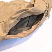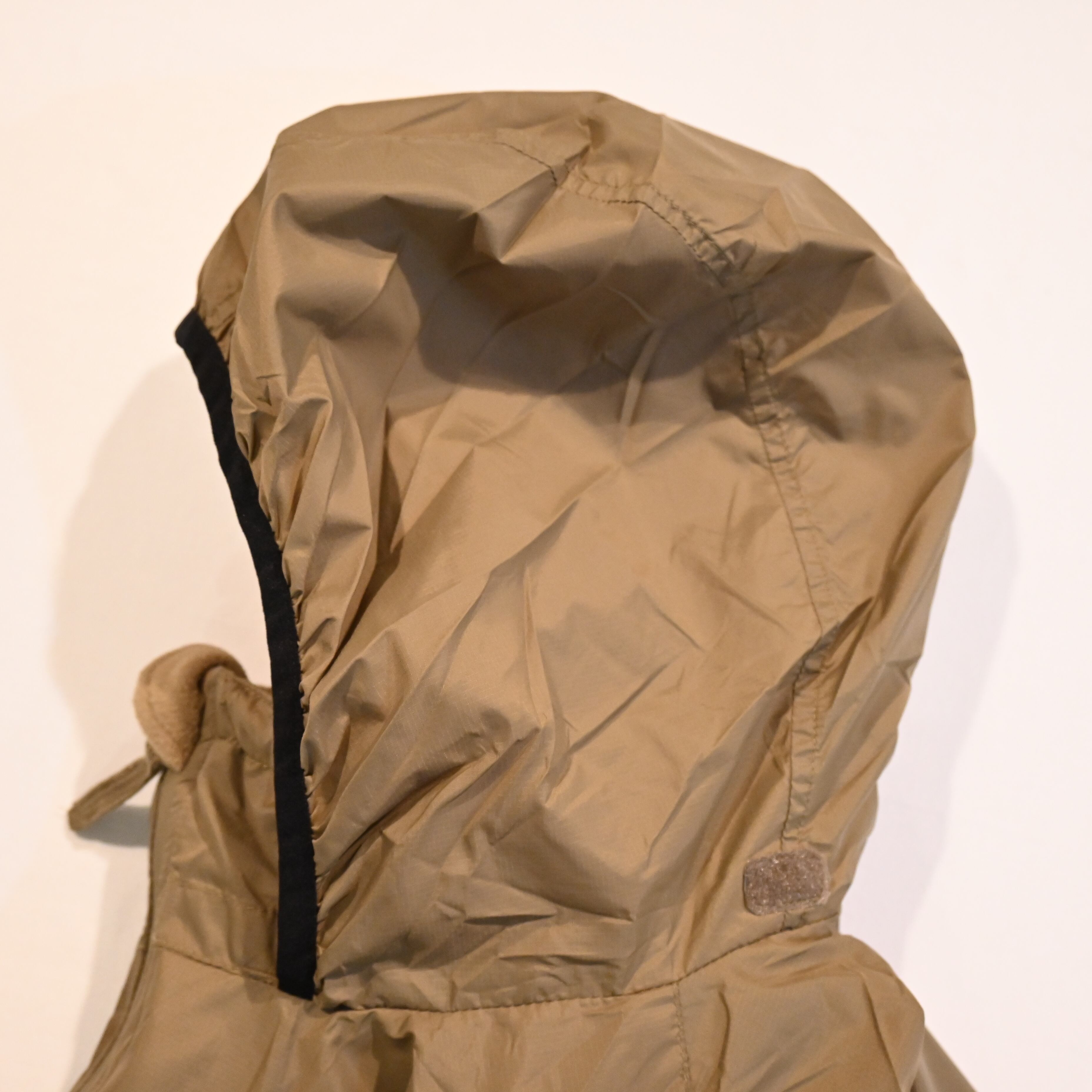 薄手ながら保温性はかなり高く、特徴的なカラーの見た目だけでなく機能性も見込めるアイテムです。襟部分にはフードが格納してあり、前見頃のポケットに全てを格納できるパッカブルの仕様です。