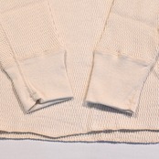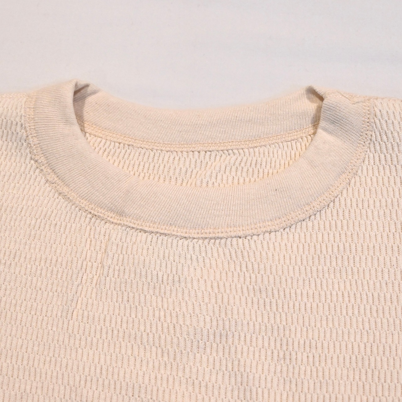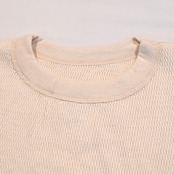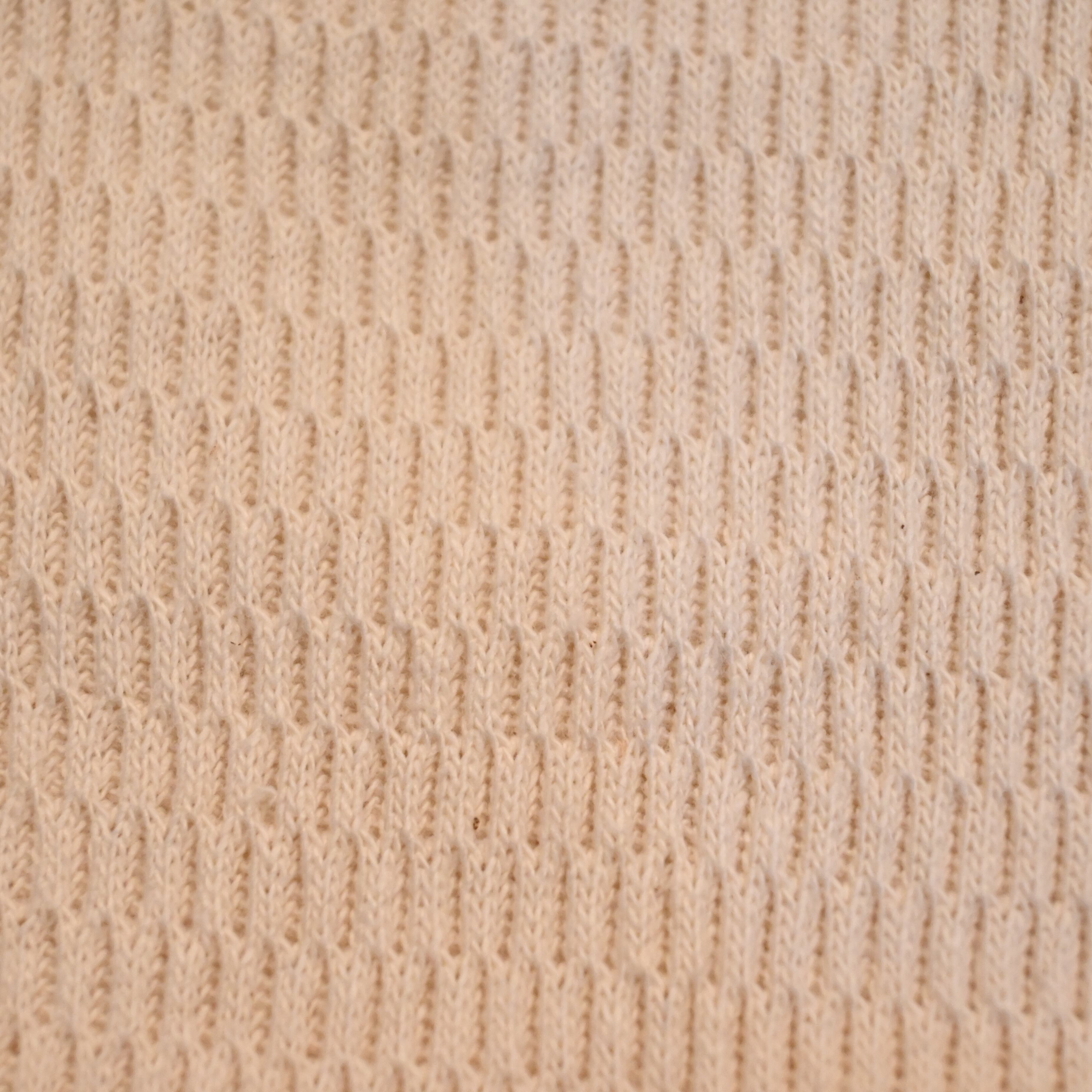 ワッフル生地の多い現在ではあまり見かけない特殊な織編のハニカムメッシュとなっており、保温性と伸縮性に優れています。