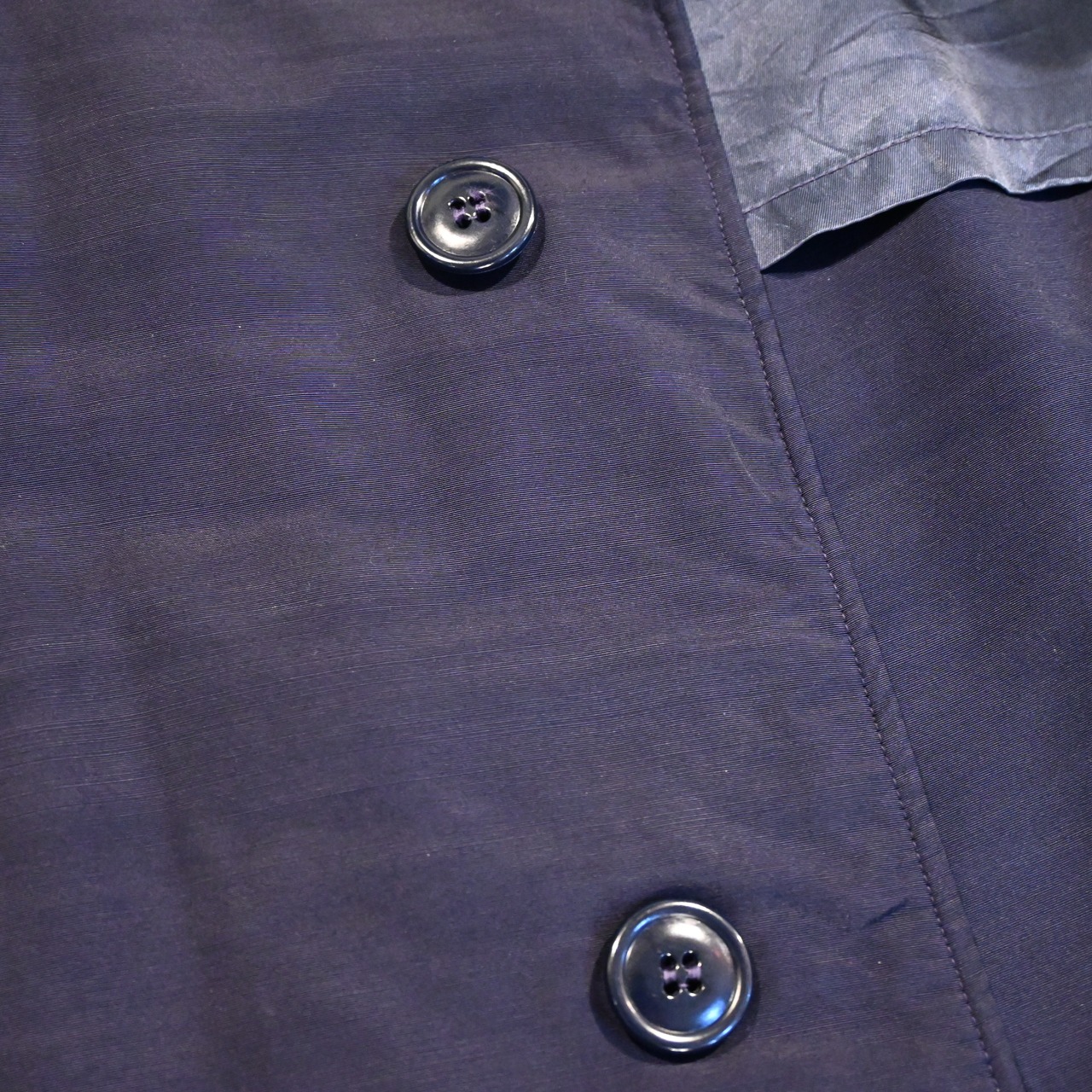 レインコートならではのナイロンの生地感はエポーレット付きのステンカラーコートとしては違和感があり、とても魅力的です。