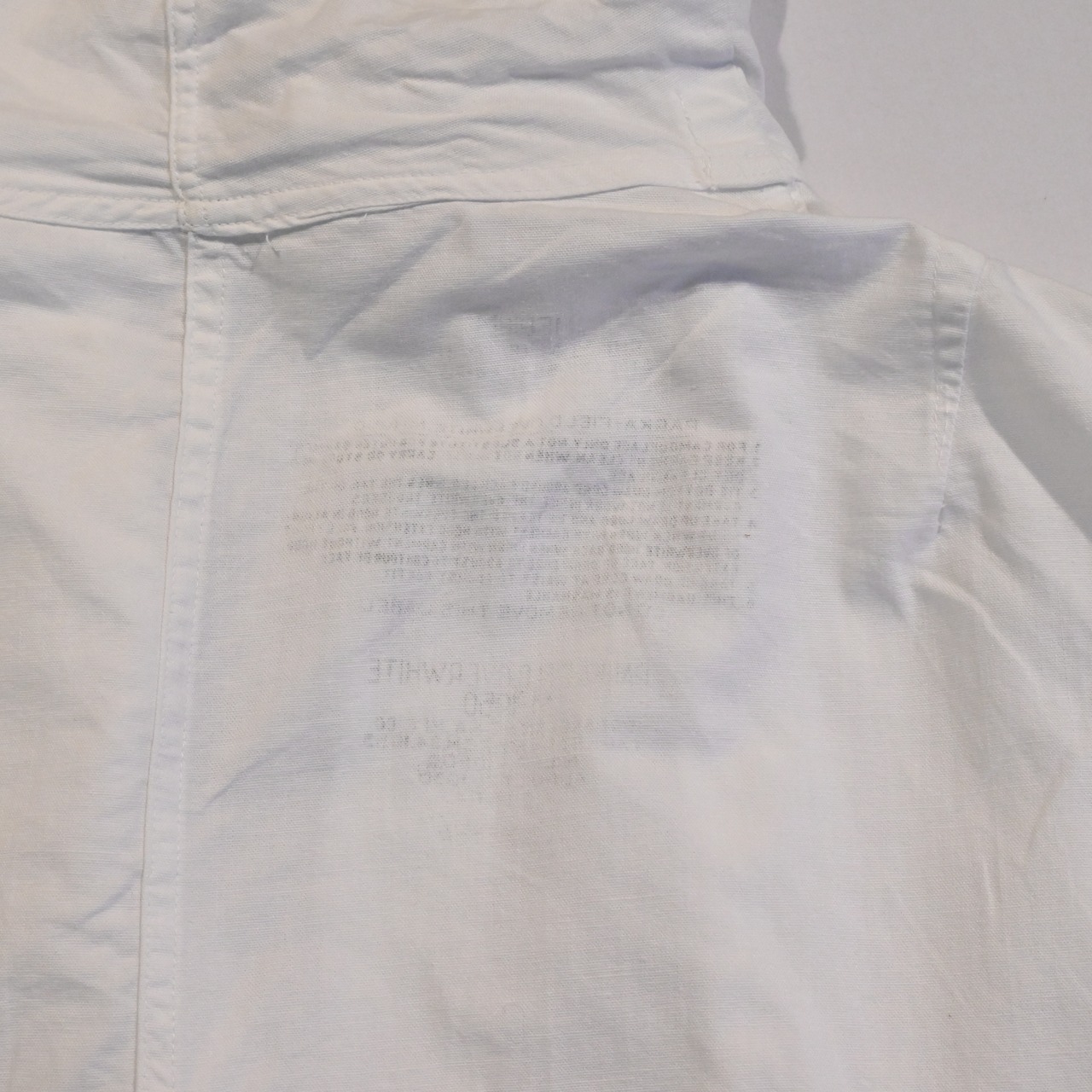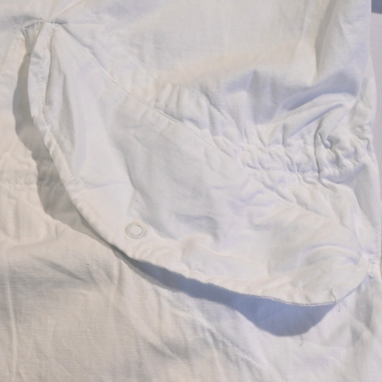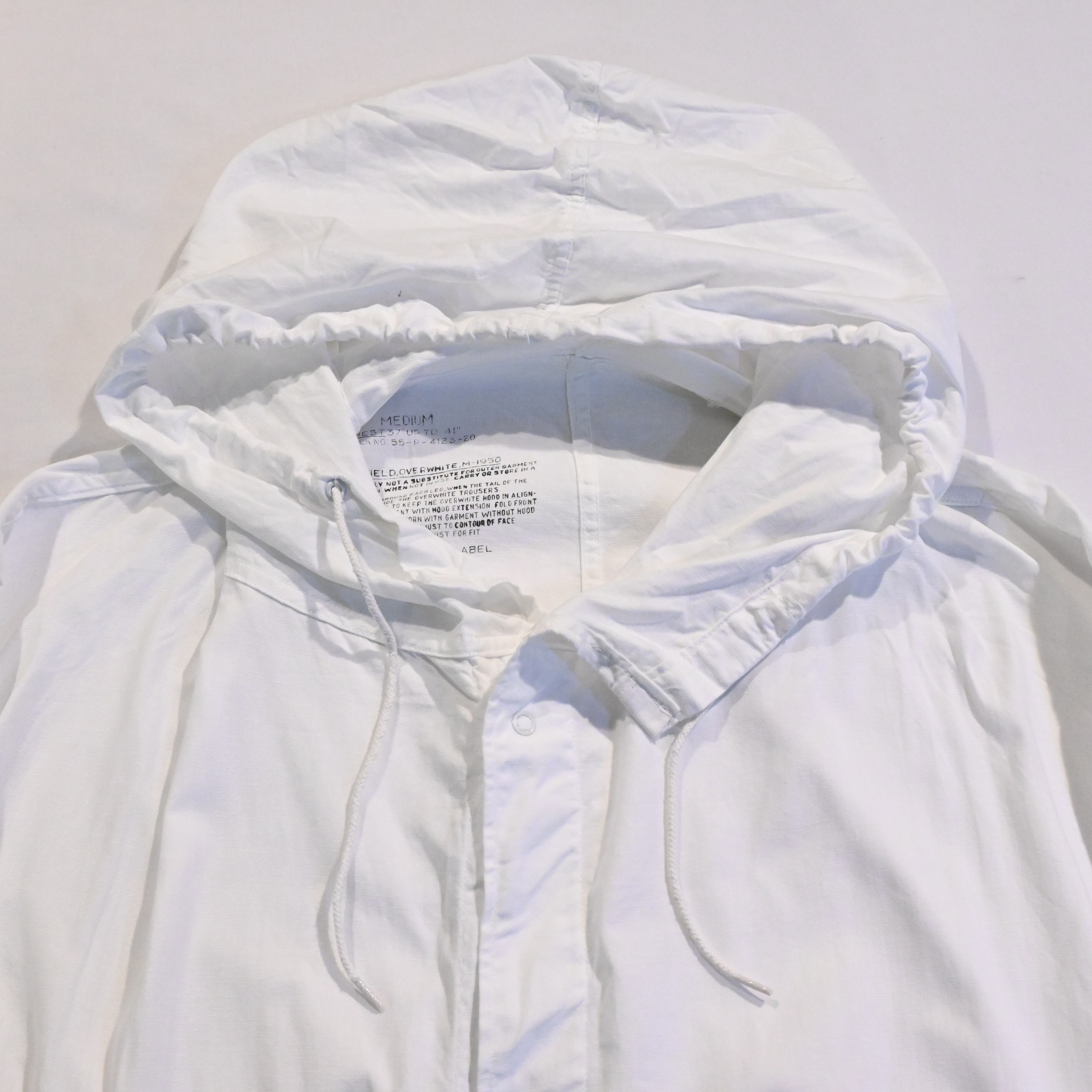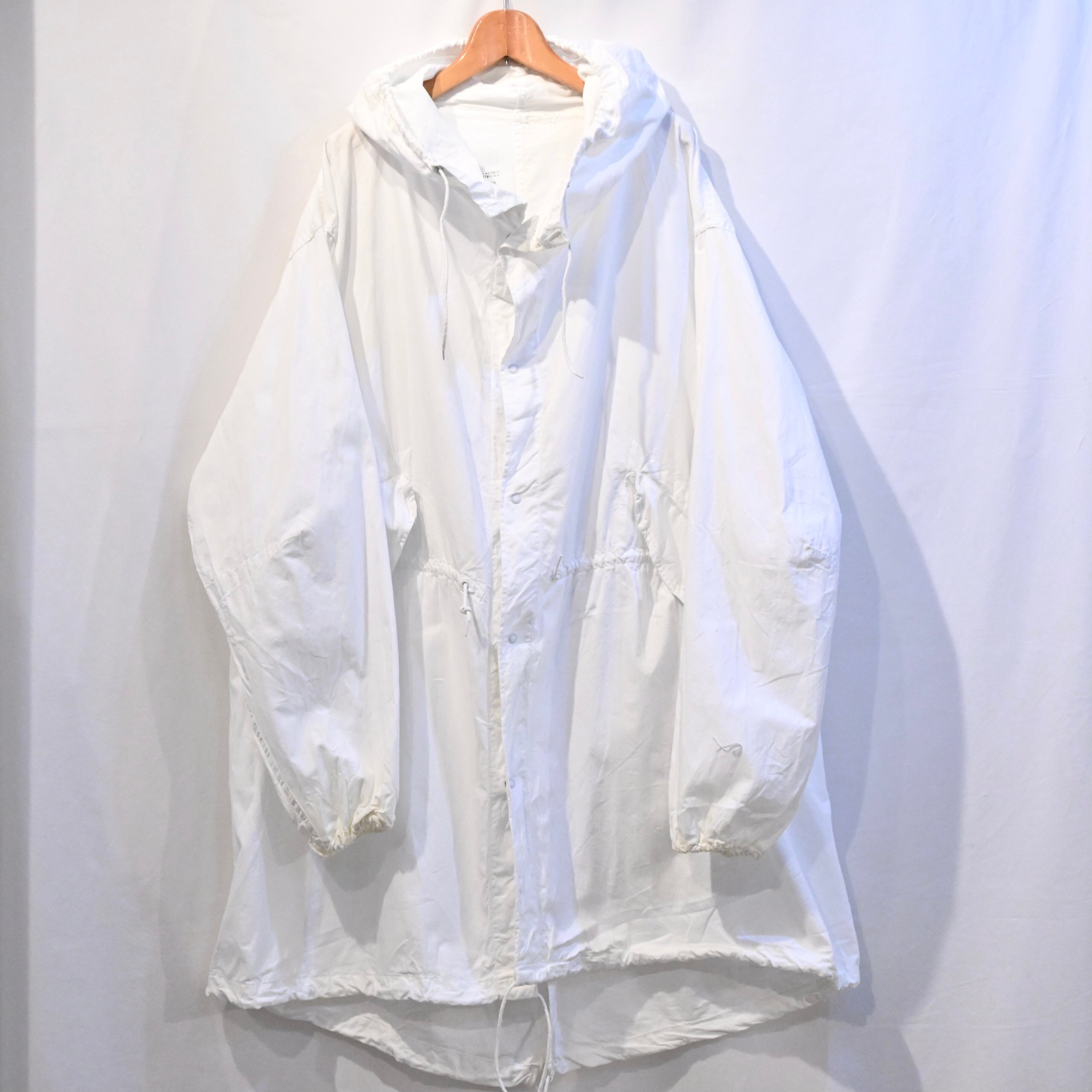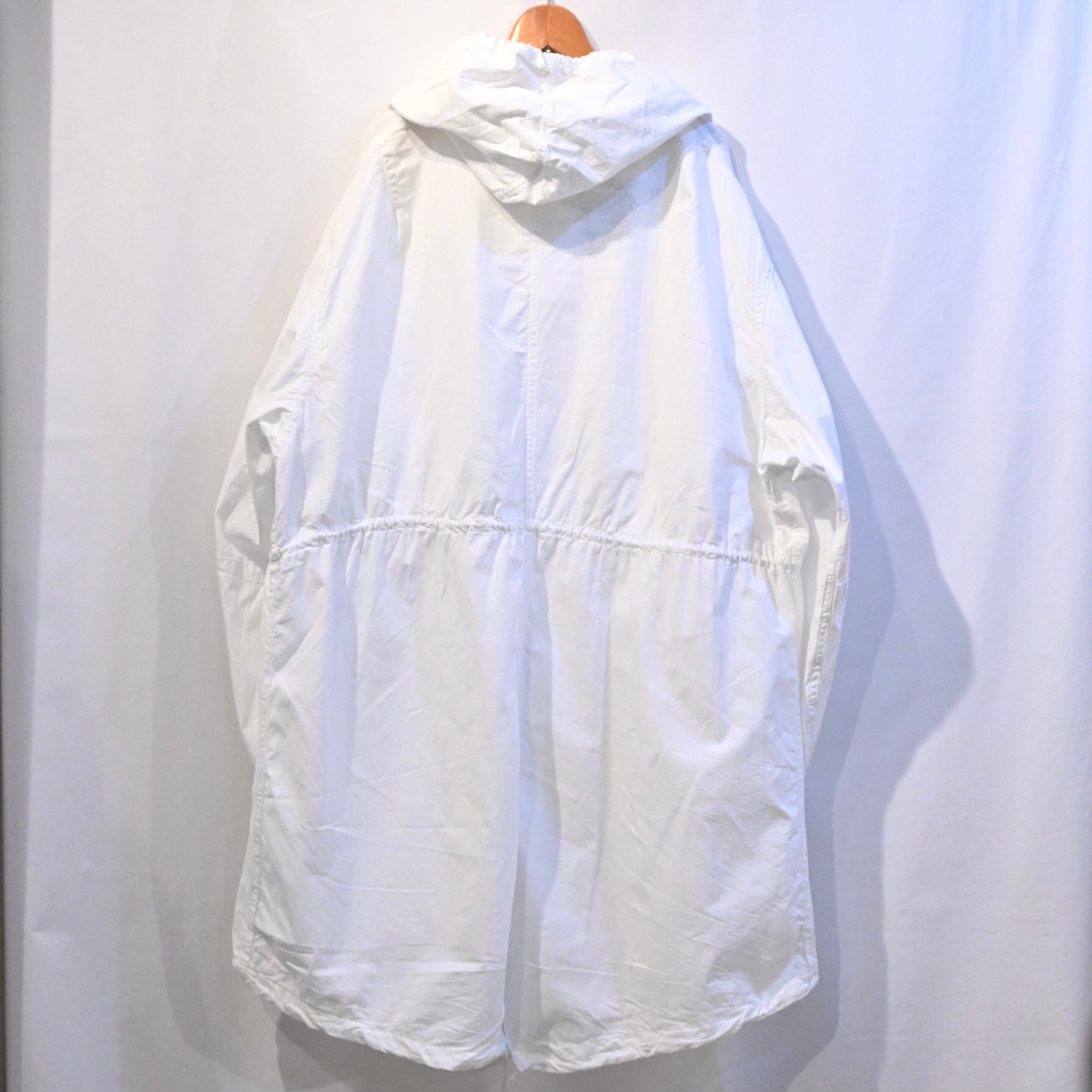 ミリタリーでも数少ないホワイトのアイテムで、身幅、アームが広く、フィッシュテールのデザインに大きなフードのシルエットは一枚で存在感があります。