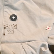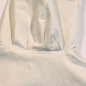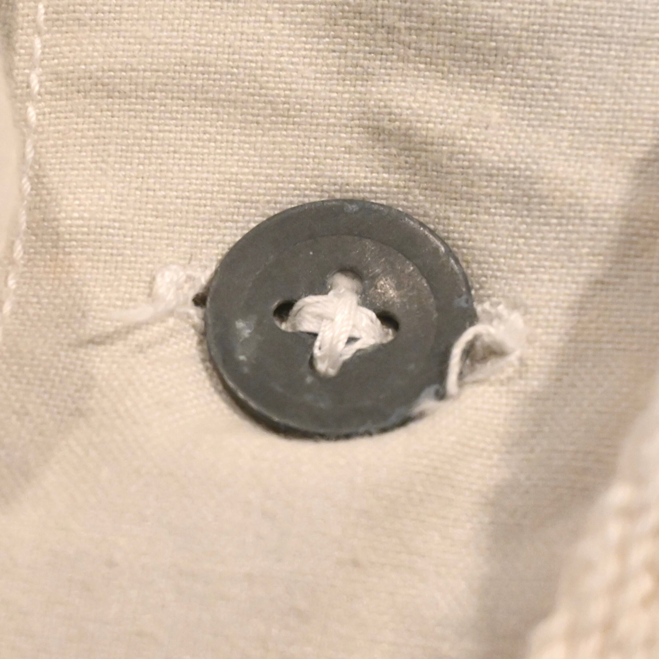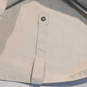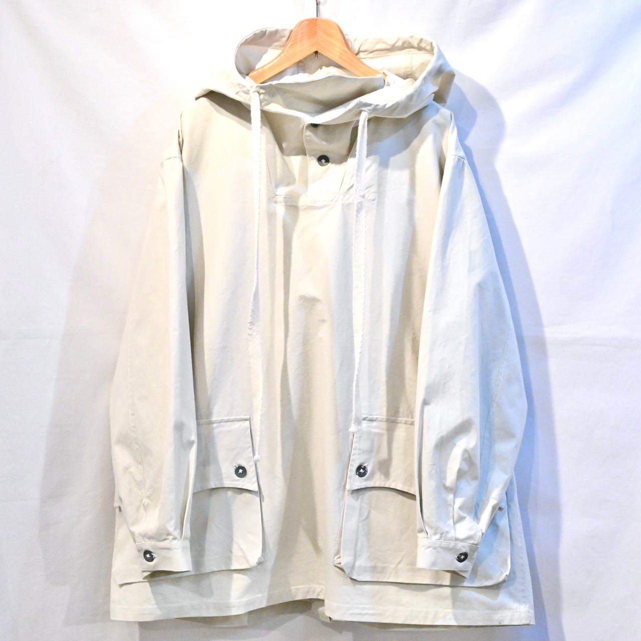 オーバーパーカーであるため、全体的にゆったりとしたシルエットで大ぶりなフードが付きます。ボタンはスチールボタンが使用されています。