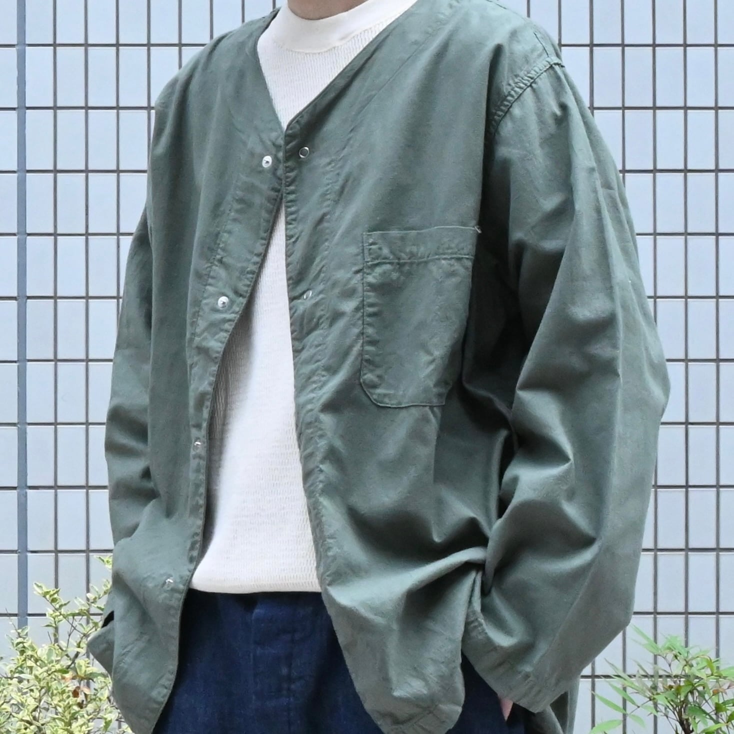 アメリカ軍らしい広い身幅とアームの太いシルエットは様々なパンツと相性が良く、スリーピングシャツならではの簡素なディティールはミリタリーアイテム特有の無骨さがなく、コーディネートに馴染みが良いです。