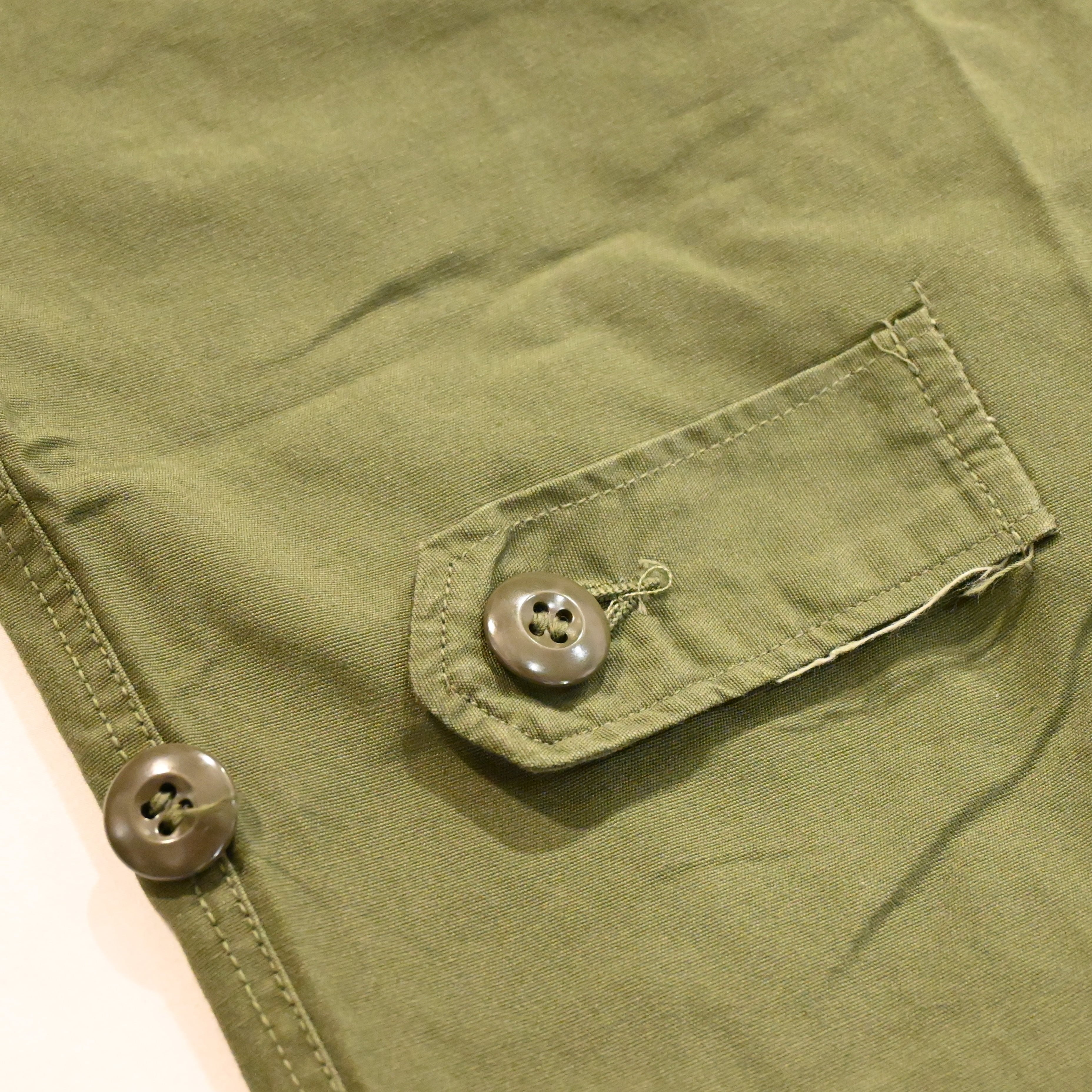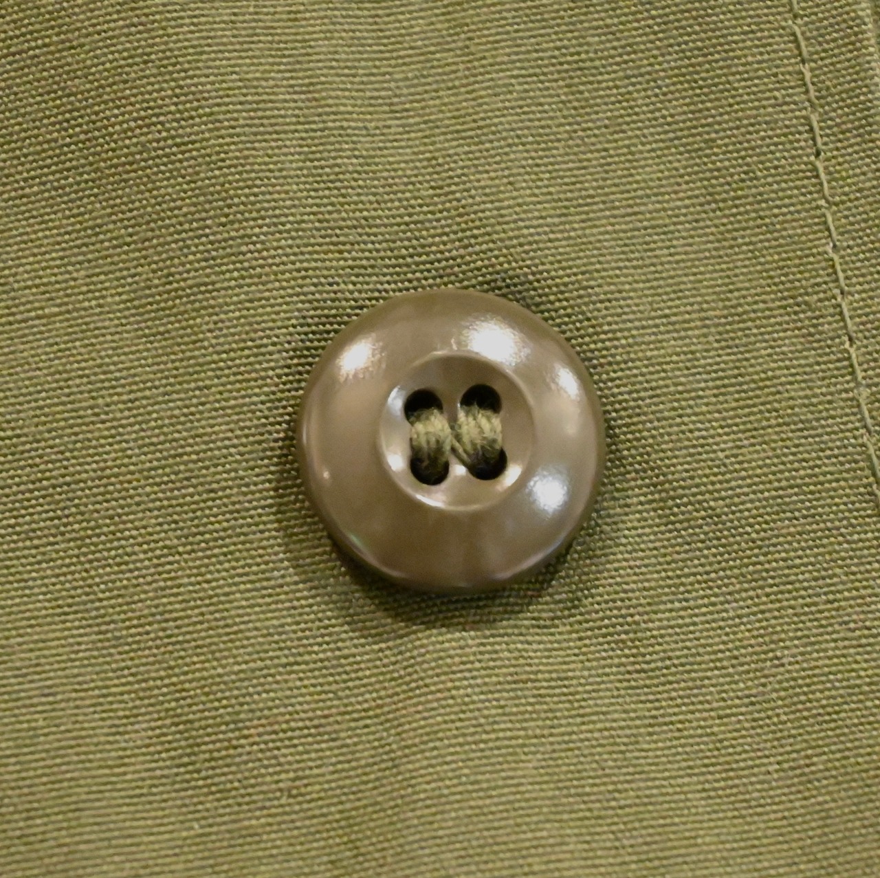 1stタイプは生地がコットンポプリンで、フラップポケットのボタンが剥き出しで腰部分にはアジャスターが付き、袖先にはVガゼットが付きます。艶ありのボタンです。