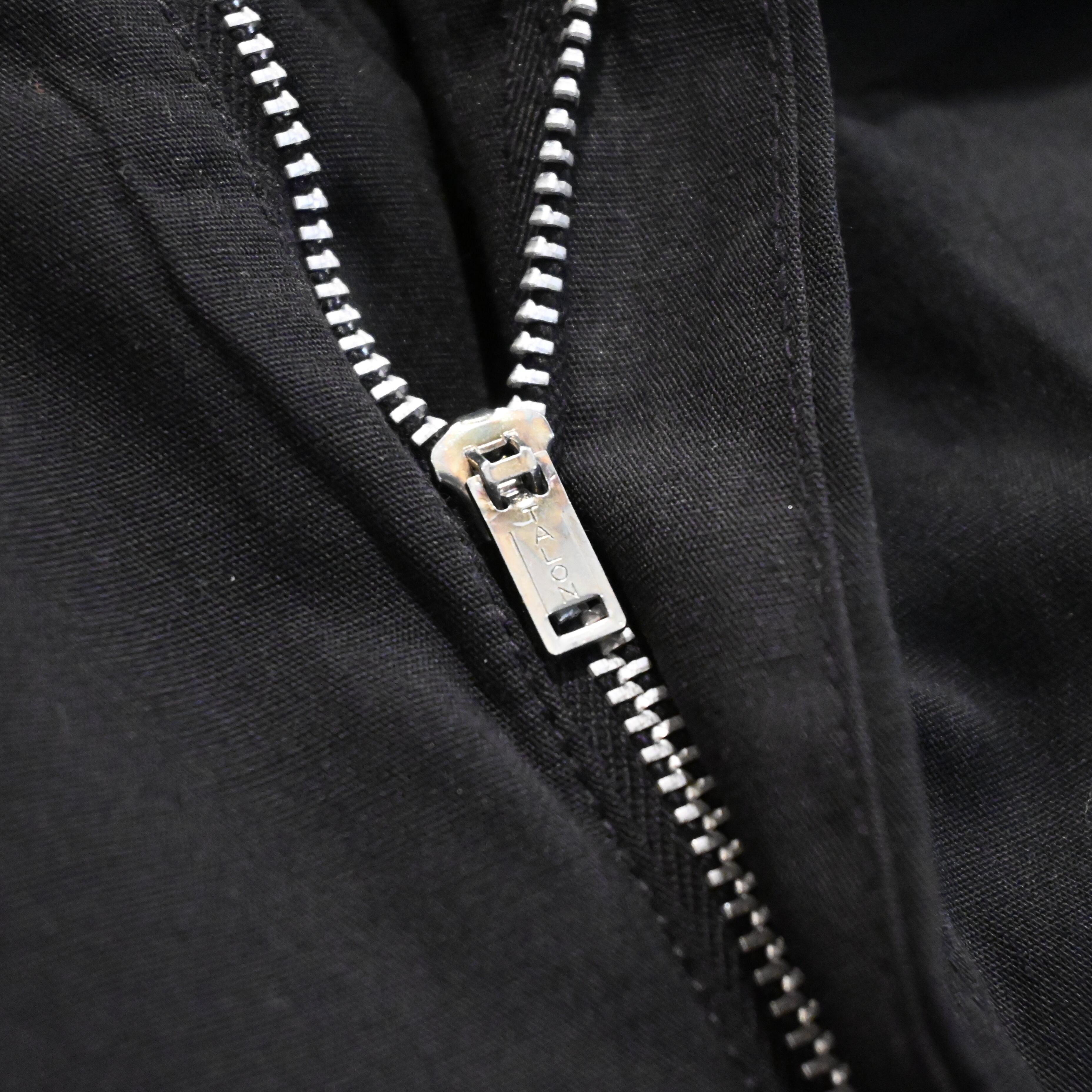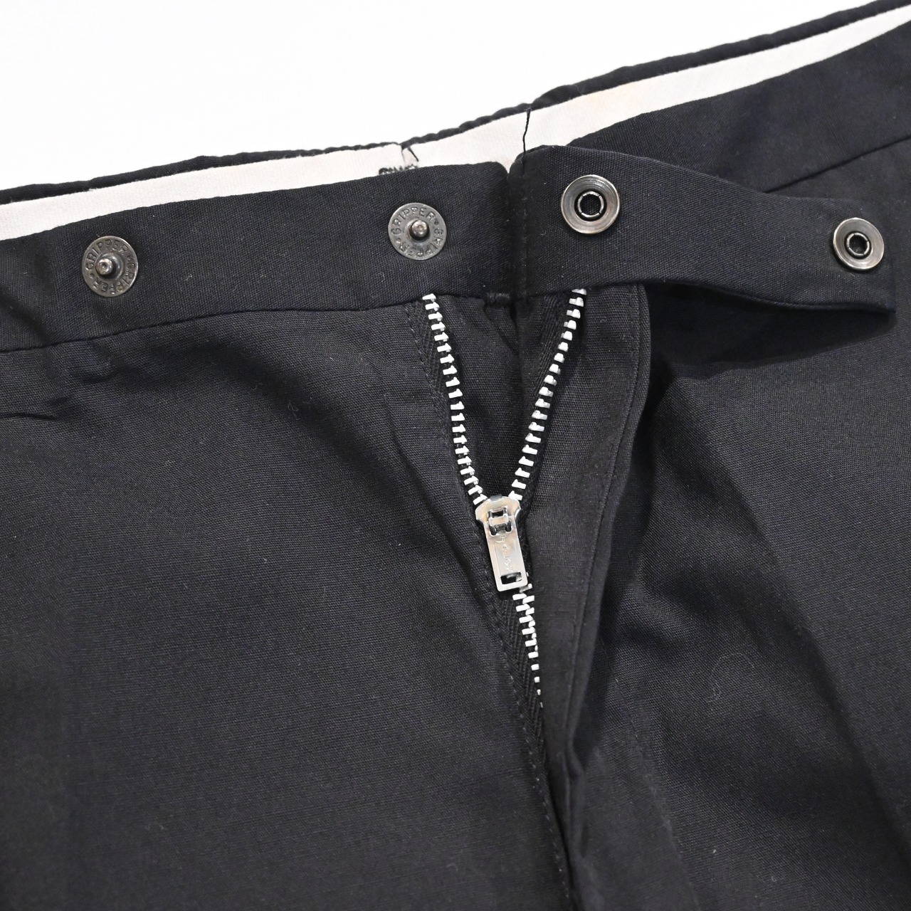 タブはビッグE、フロントはタロンジップ、ウエスト部のボタンはグリッパーのスナップボタンです。
