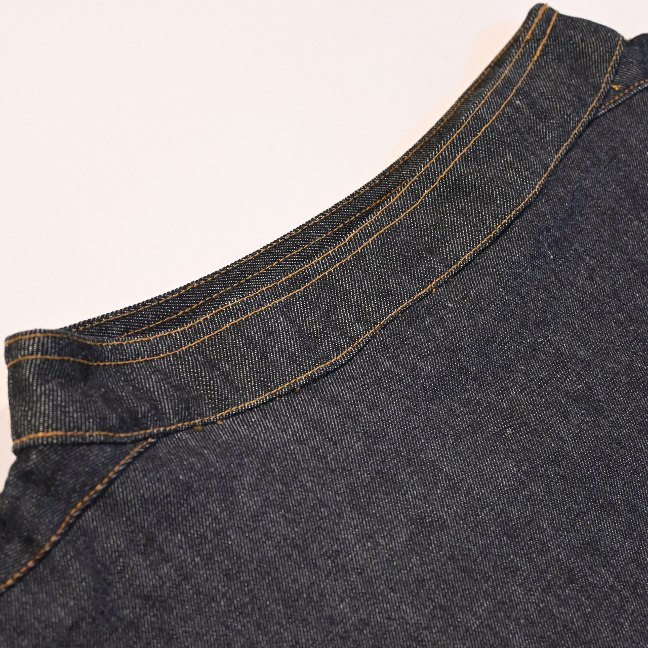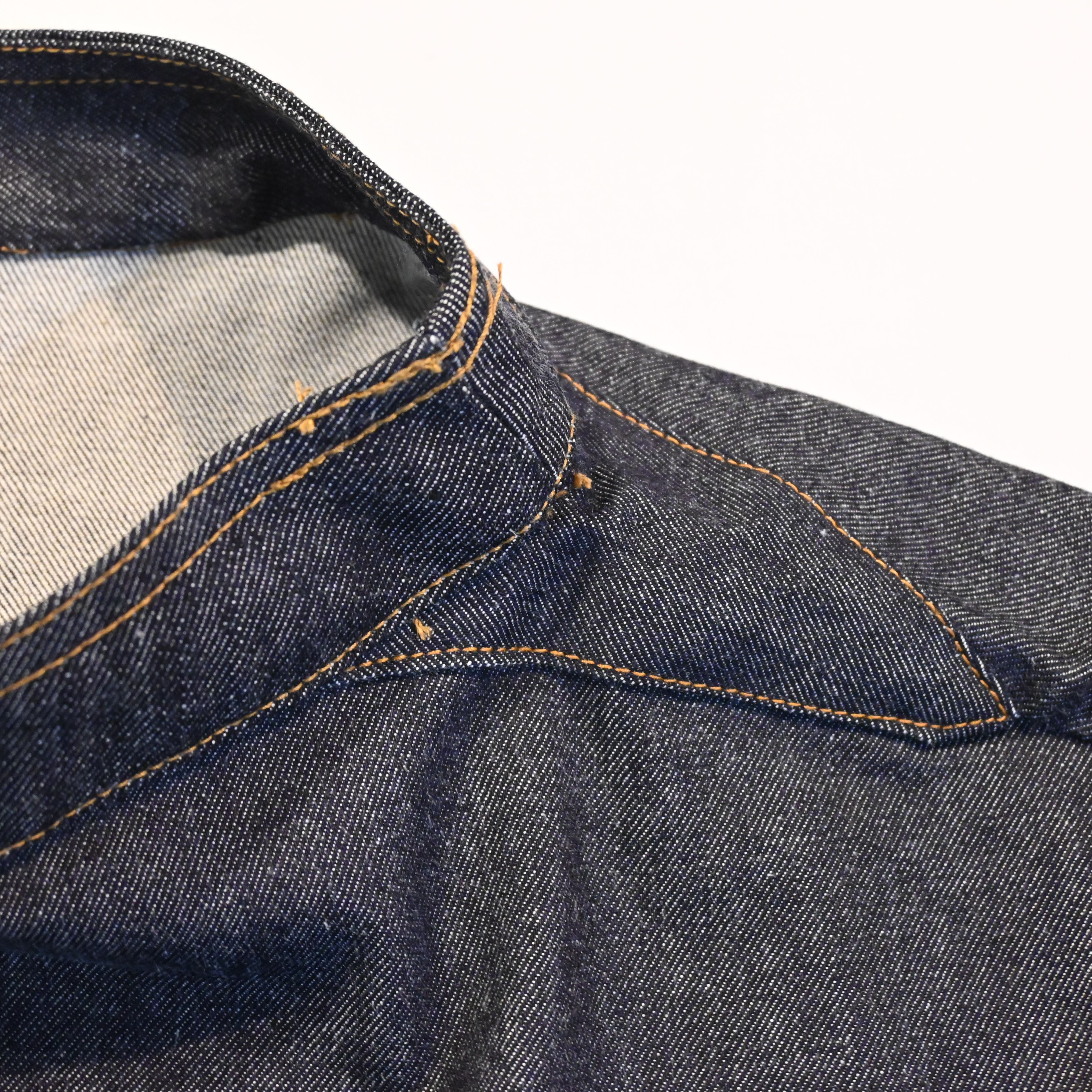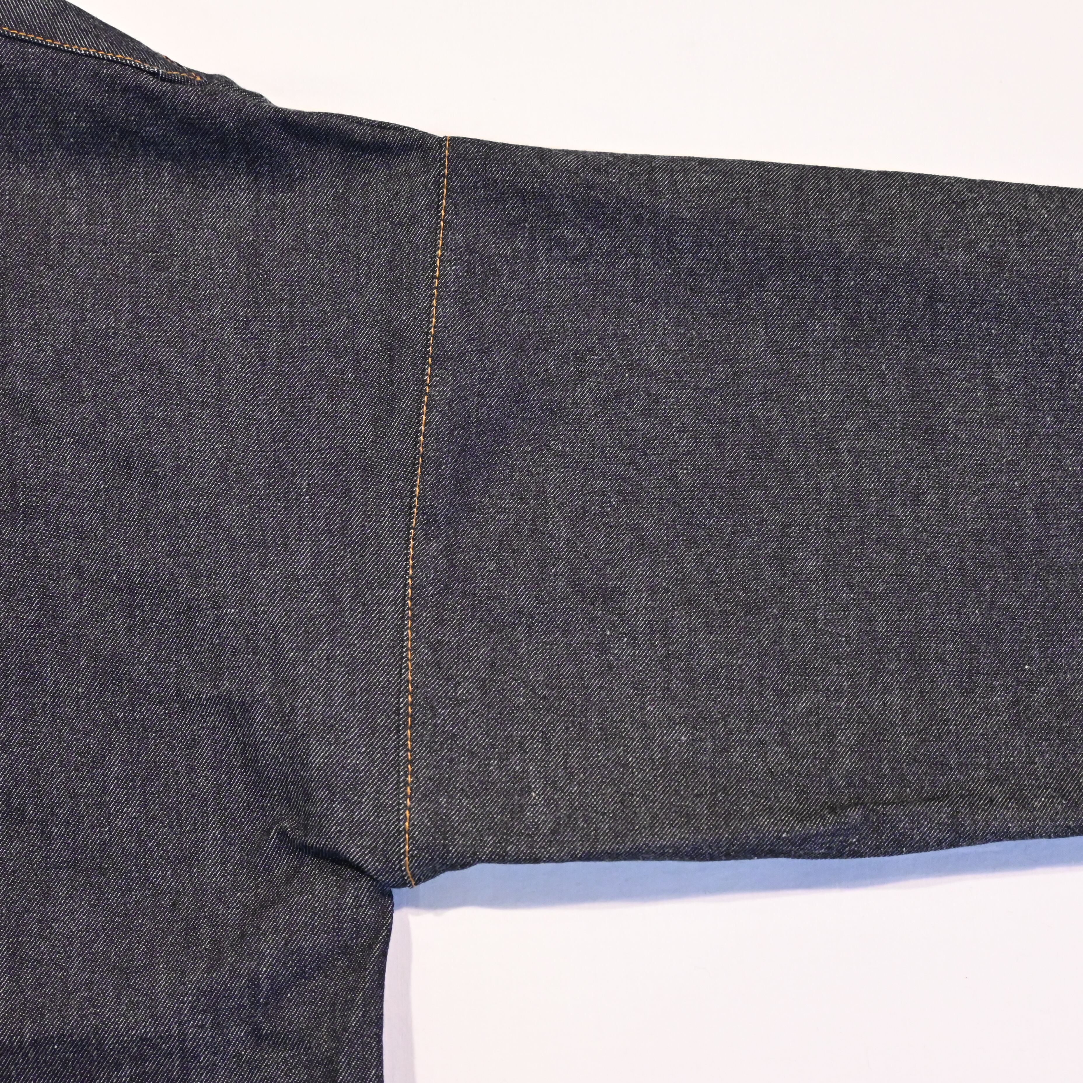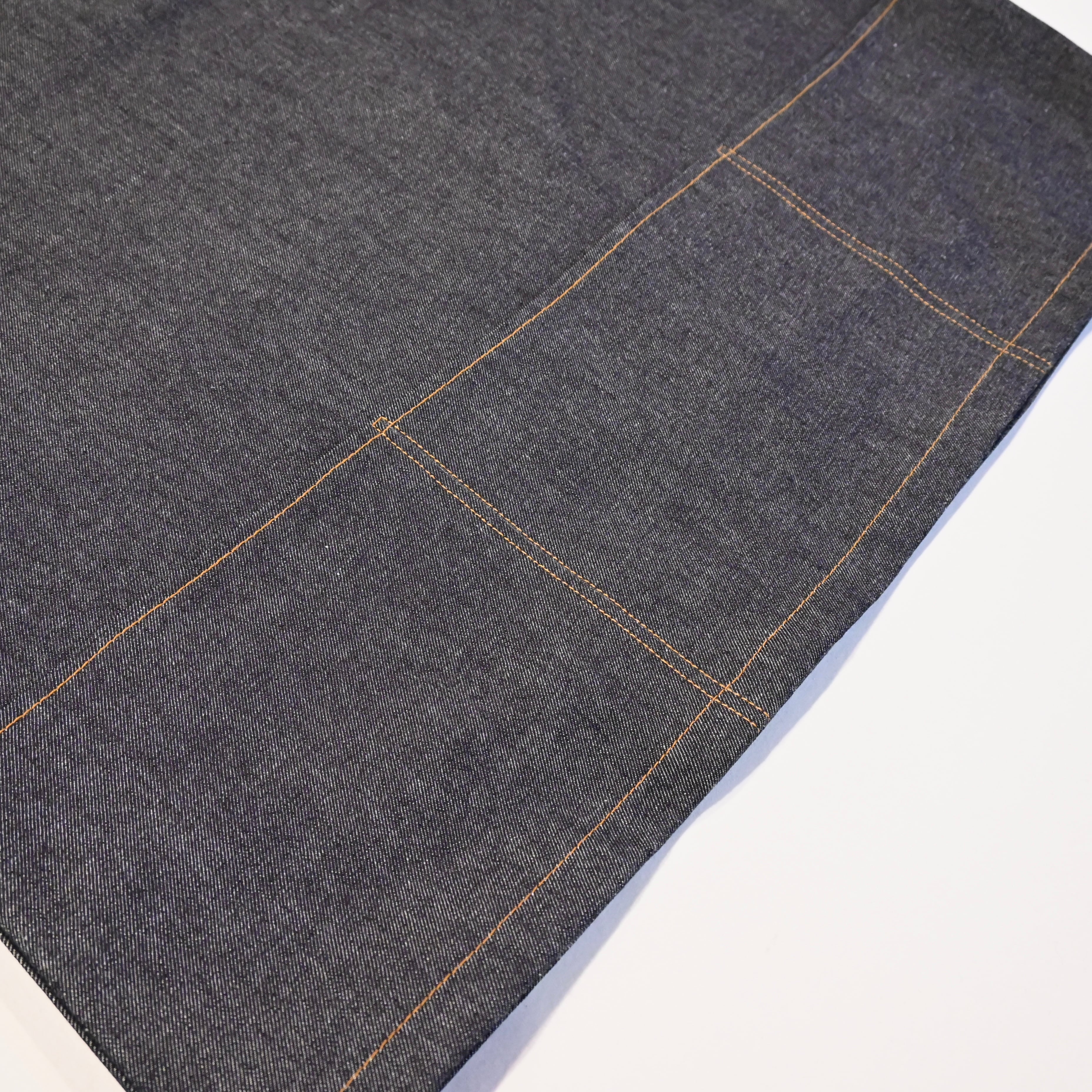 ドリル地の物が多いですがこちらはデニムで作られたもので、直線的でシンプルなデザインとのバランスが魅力的なアイテムです。