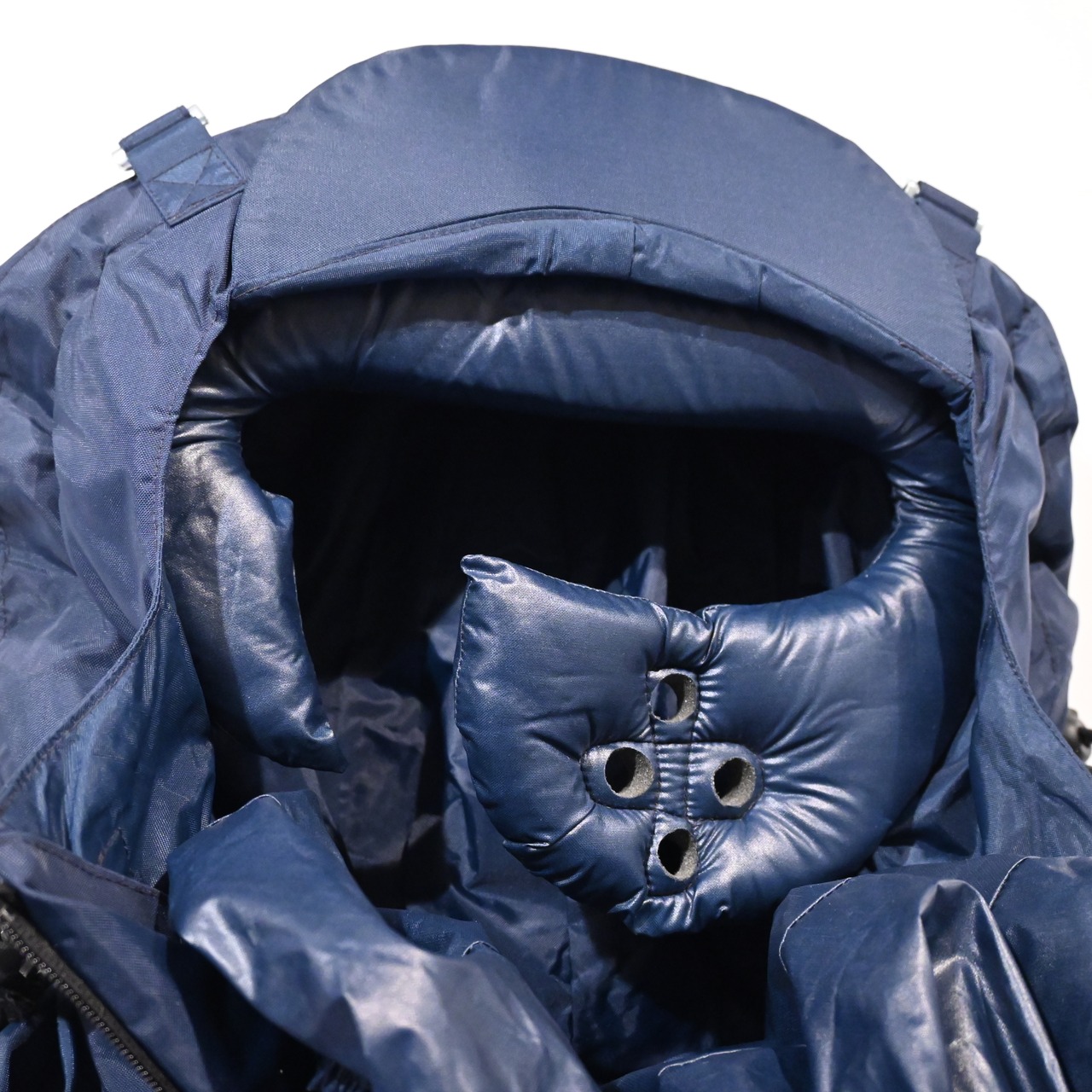 フロントは防風のためのマジックテープのフラップとジップの二重構造で、フードの中にはクッション性のある素材が使用されていて、後ろ側にはクロスにアジャスター付きのストラップが施されています。