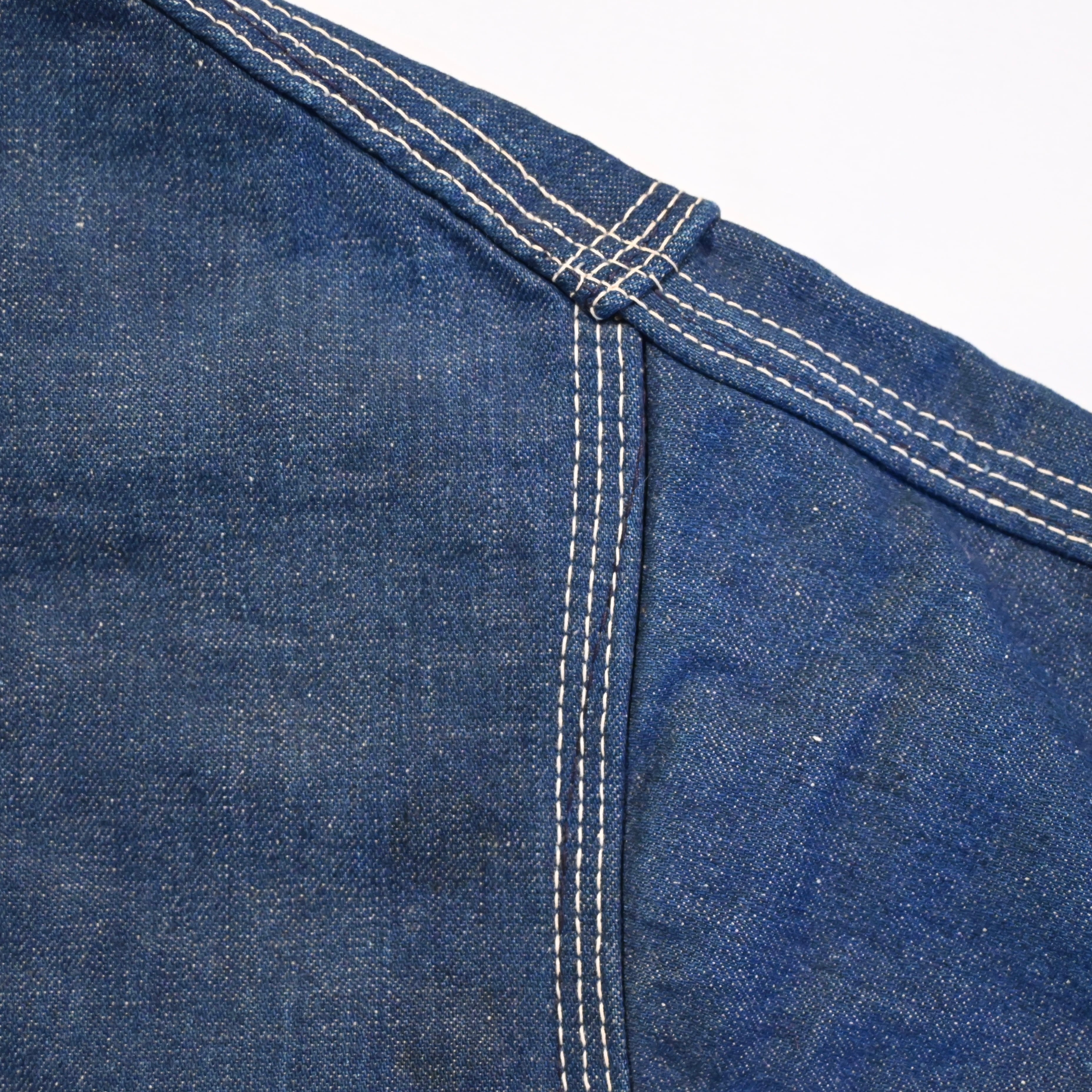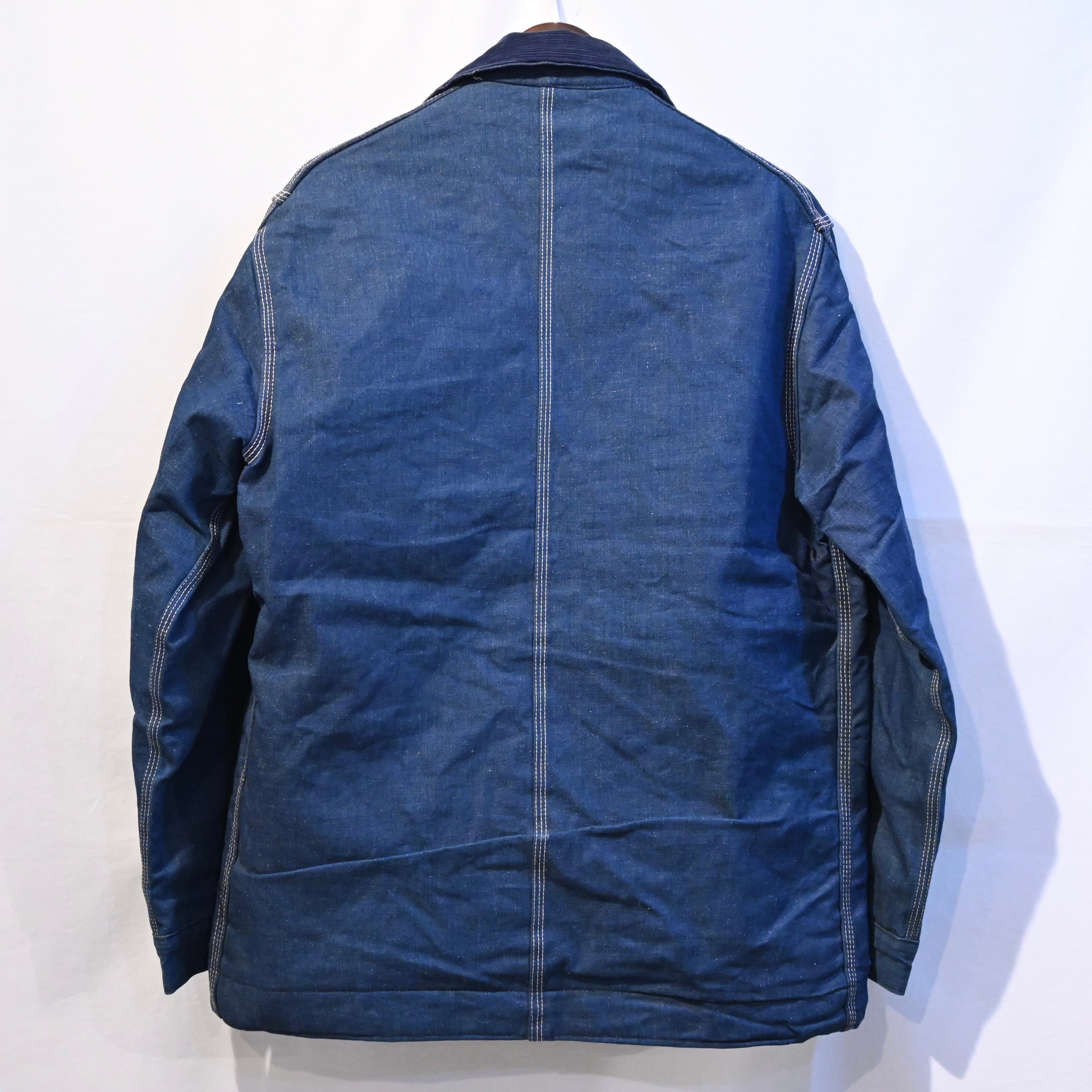 襟はコーデュロイの切り替えになっています。粗さのあるデニムの生地感と堅牢なつくりが魅力的なアイテムで、デニムの色落ちを楽しみながら長くお使いいただけます。