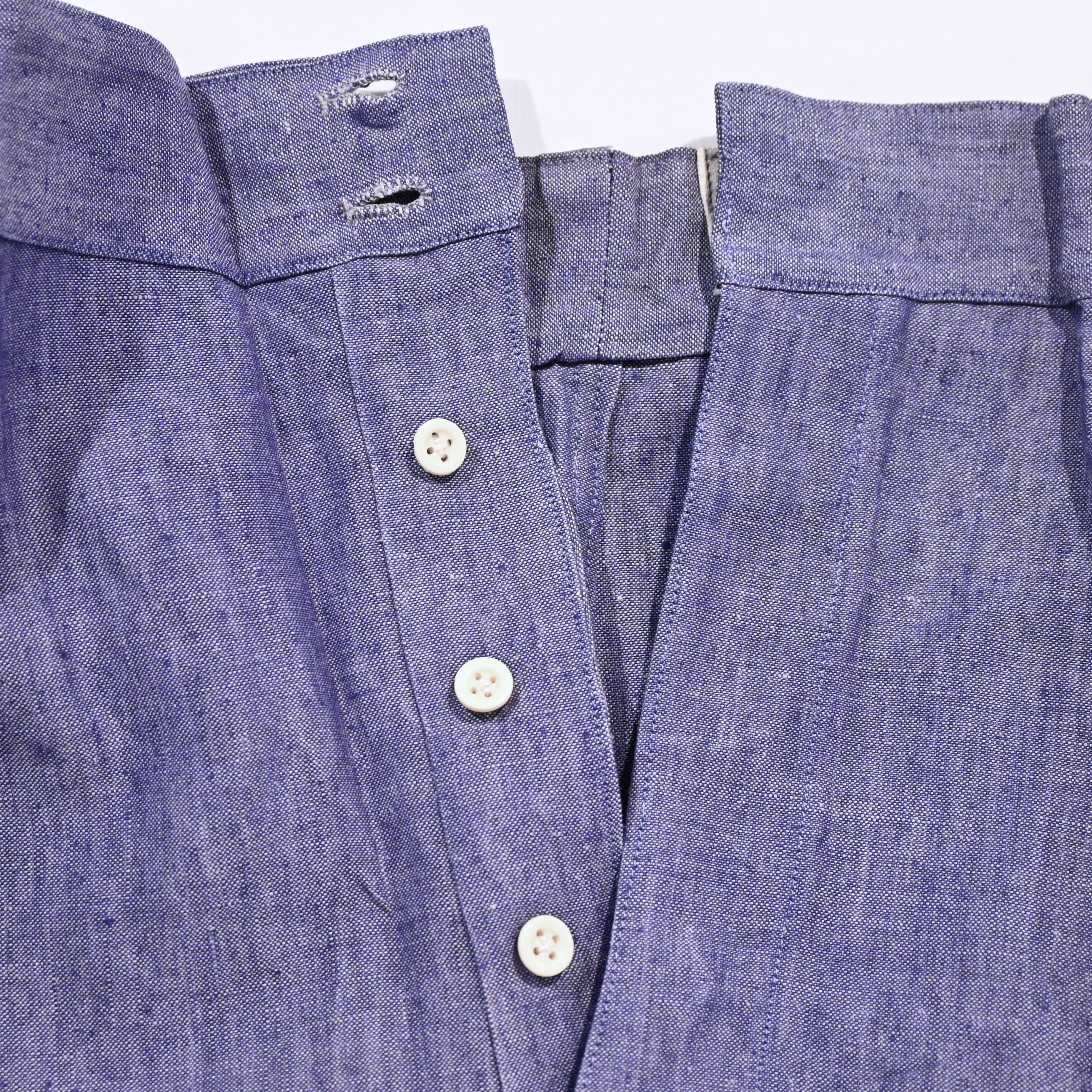 涼しさのあるリネンの生地感だけでなく、紫がかったサックスのカラーは、夏のコーディネートにも取り入れていただきやすいです。