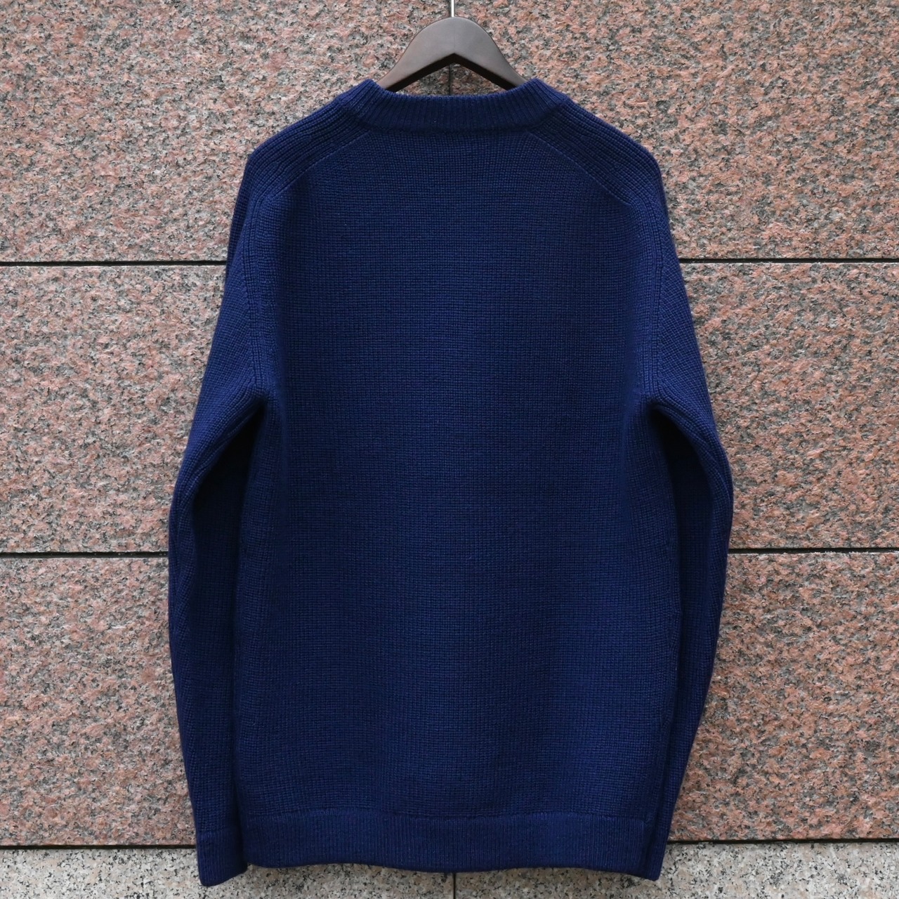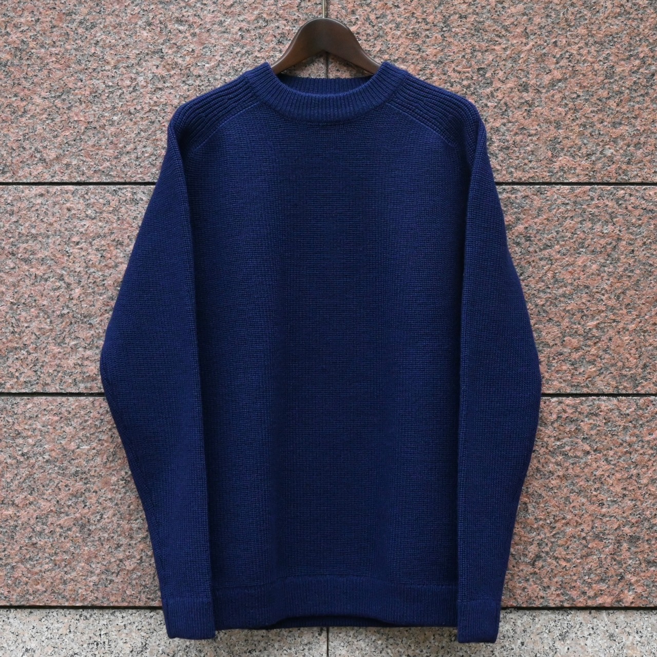 ざっくりとした網目の固めのウールの生地感で、深みのあるブルーのカラーもあいまって、とても高級感のあるニットです。