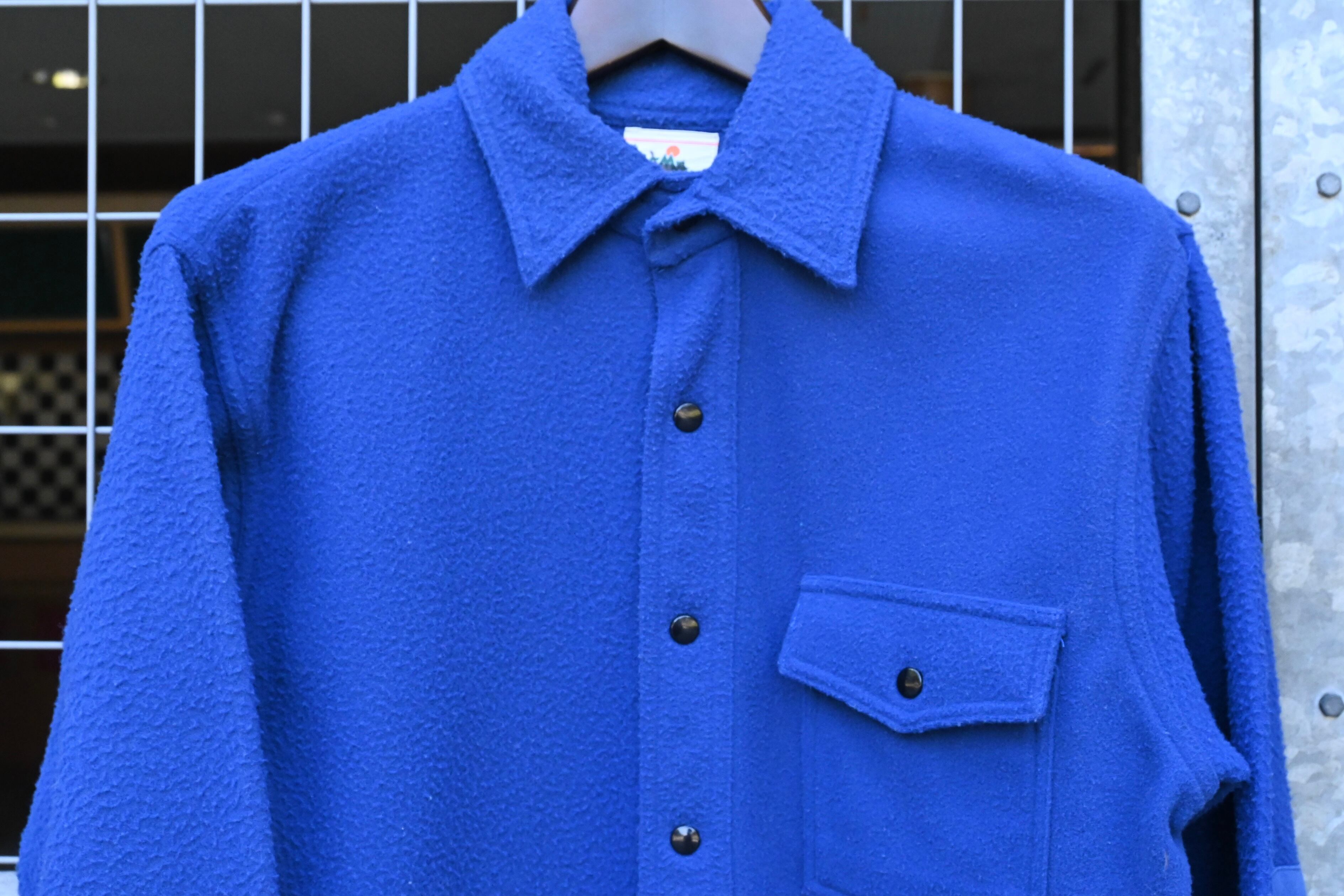 このブランドに限らず、物として少ないフリース素材のシャツです。フロントがスナップボタンだったり、エルボーパッチ付きであったりとディティールが魅力的です。