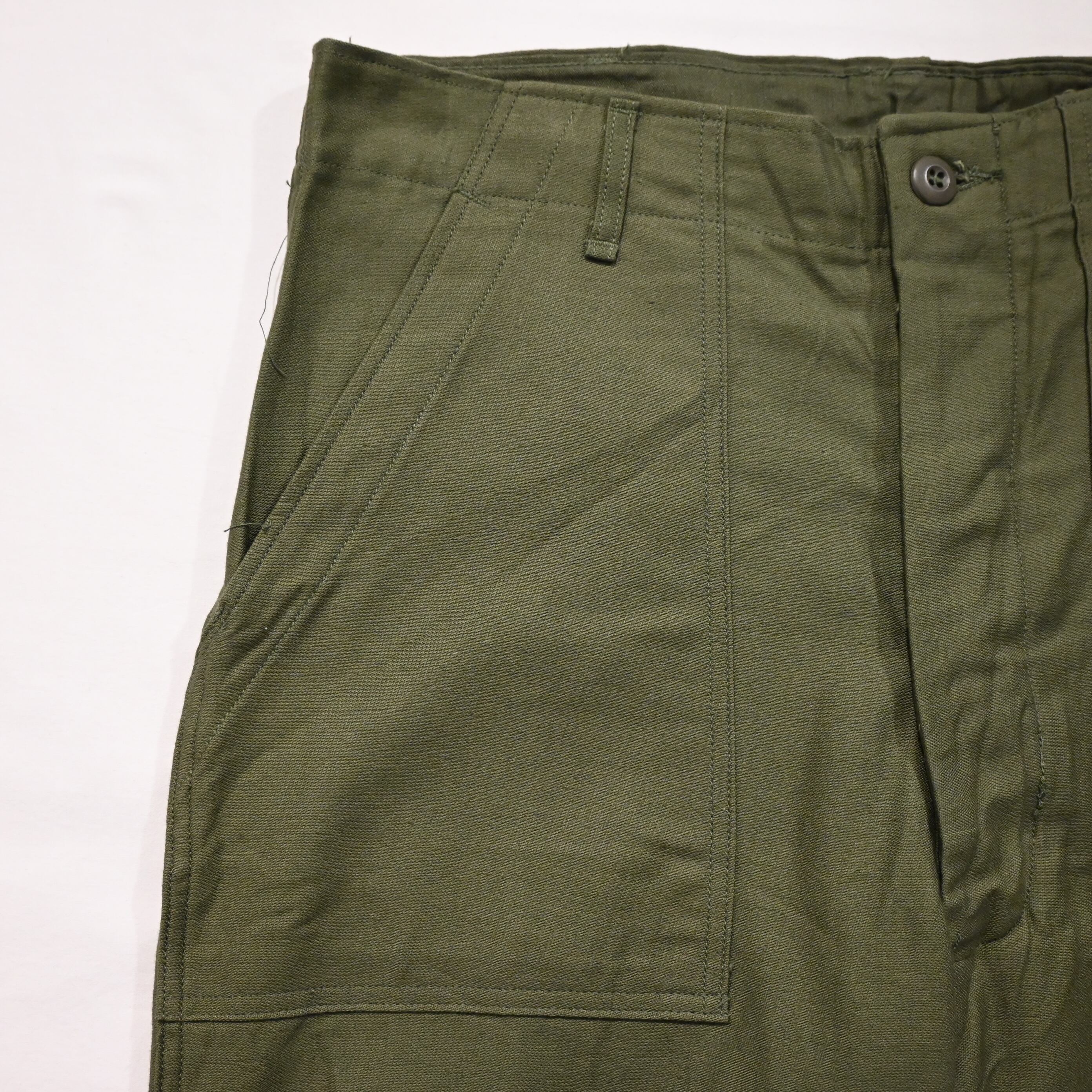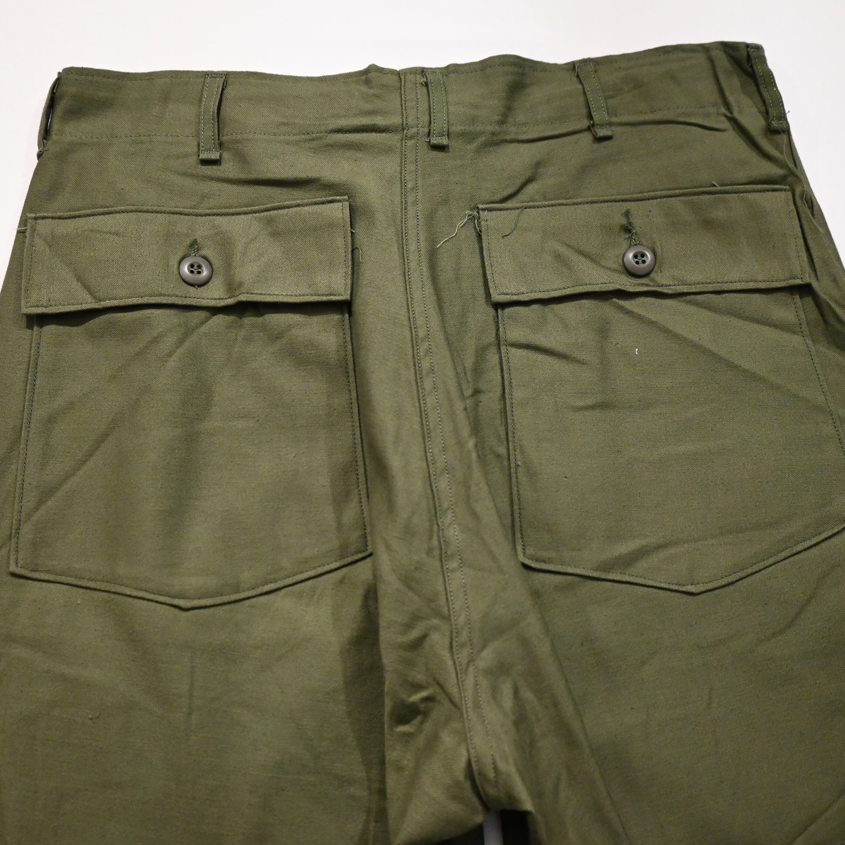 フロントはボタンフライのタイプで、BDUの艶なしボタンが使用されています。フロントポケットはダブルステッチです。