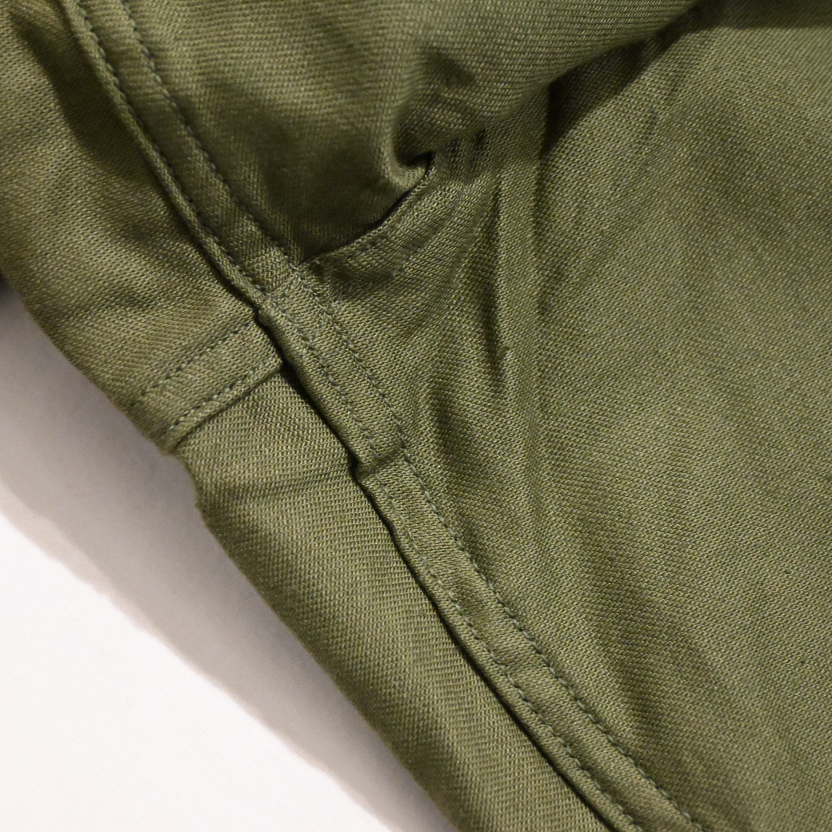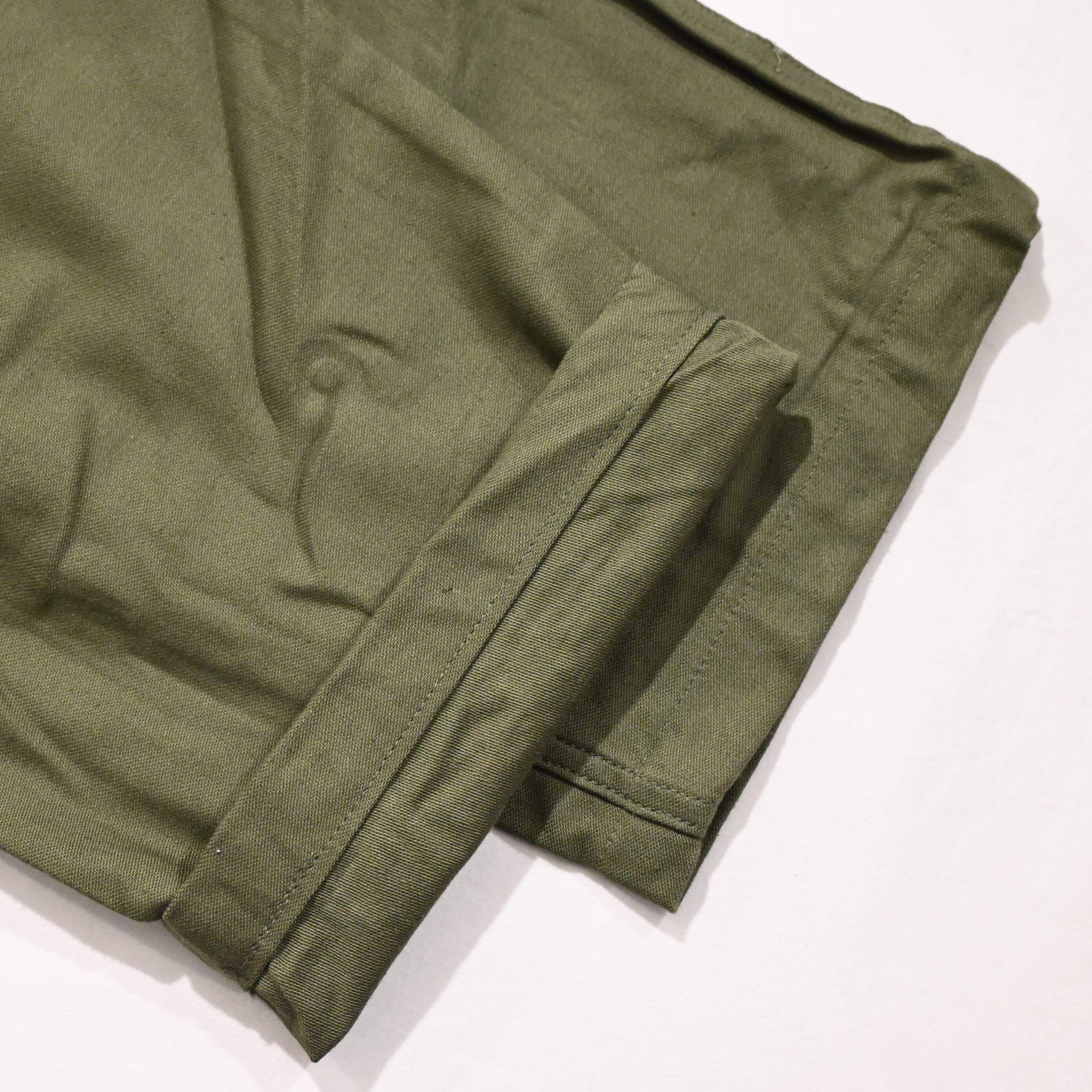 コットンサテンの柔らかい生地感で、季節を問わず着用していただけるミリタリーパンツです。カーゴポケットのないシンプルな作りでカラーがオリーブドラブである点が魅力です。