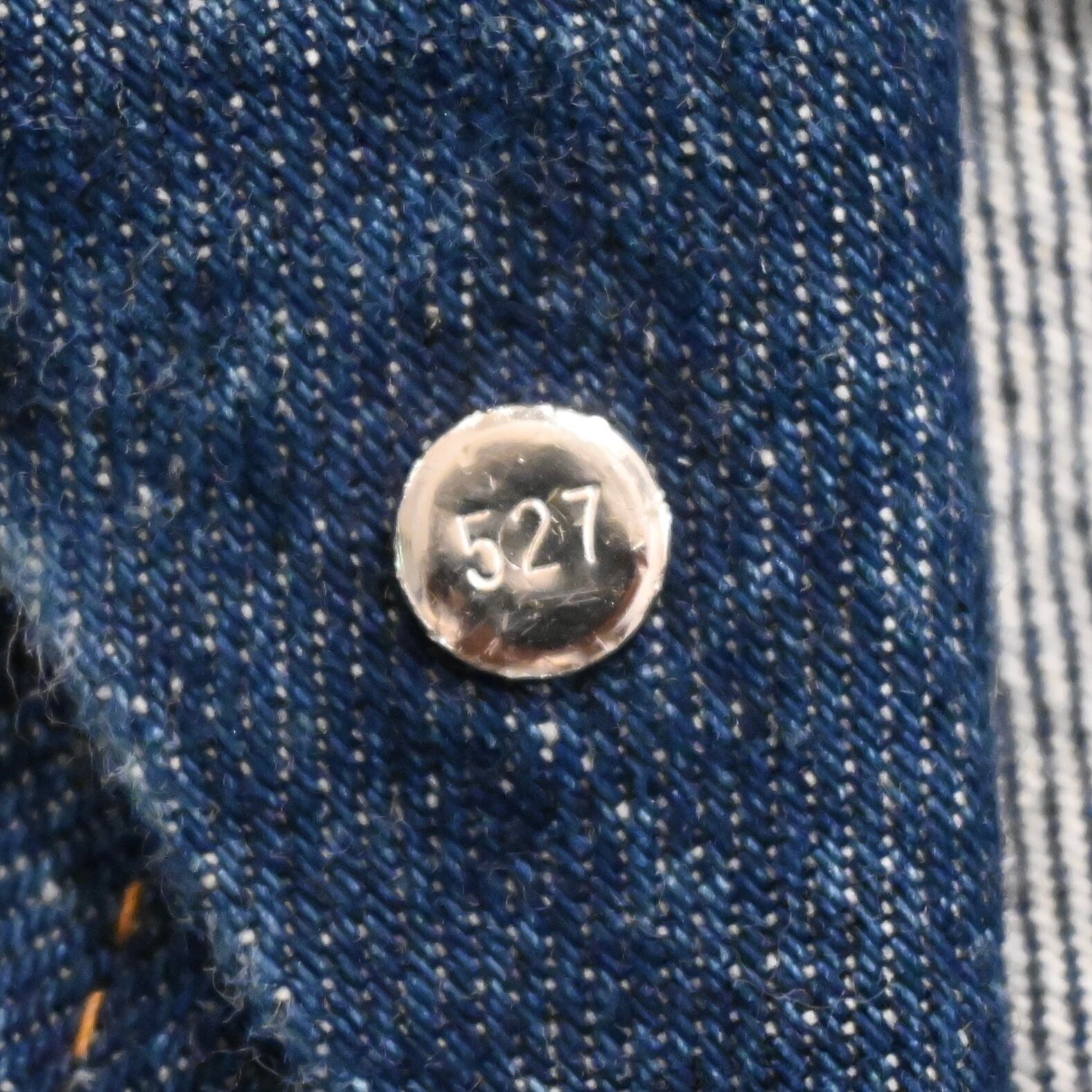 トップボタン裏は527番で、ウォッシュのかかったデッドストックです。44とサイズも大きく、トレンド感のあるシルエットで着用していただけます。