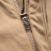 トップボタンは樹脂ボタンのタイプで、フロントはプレンティスのアルミジップが使用されています。
