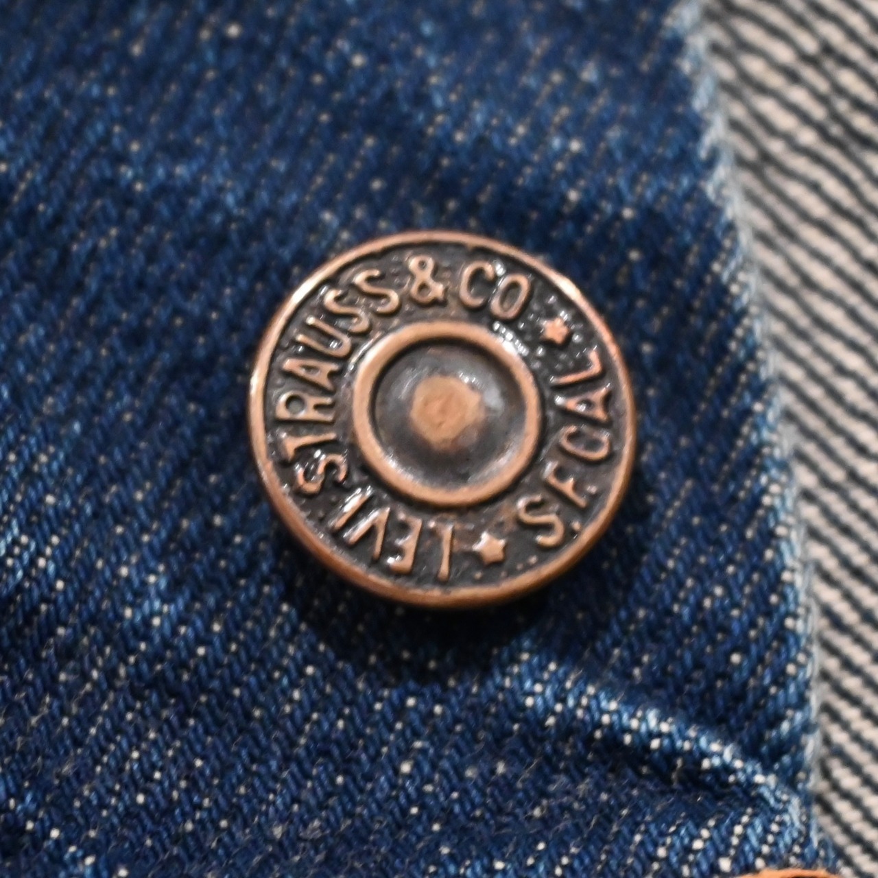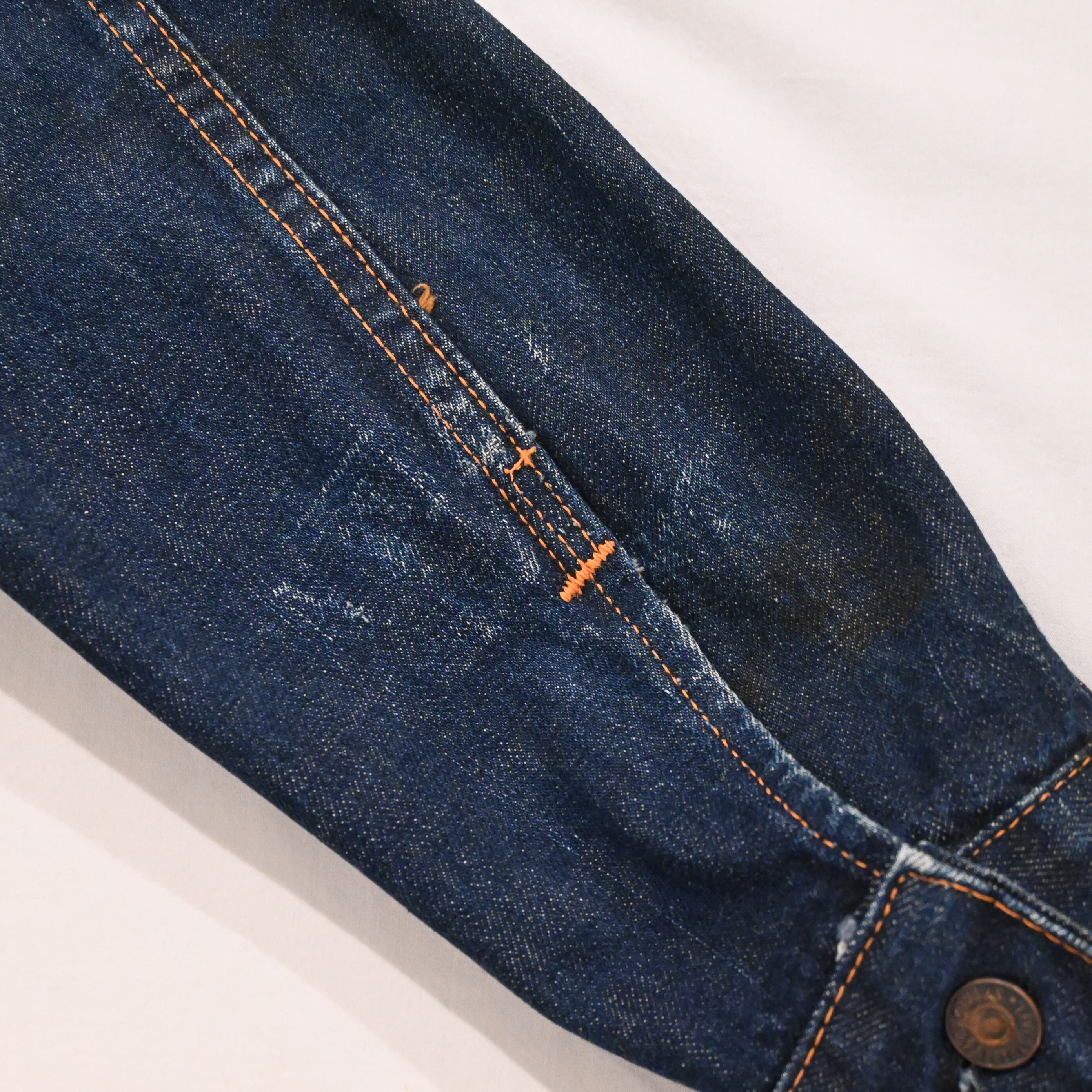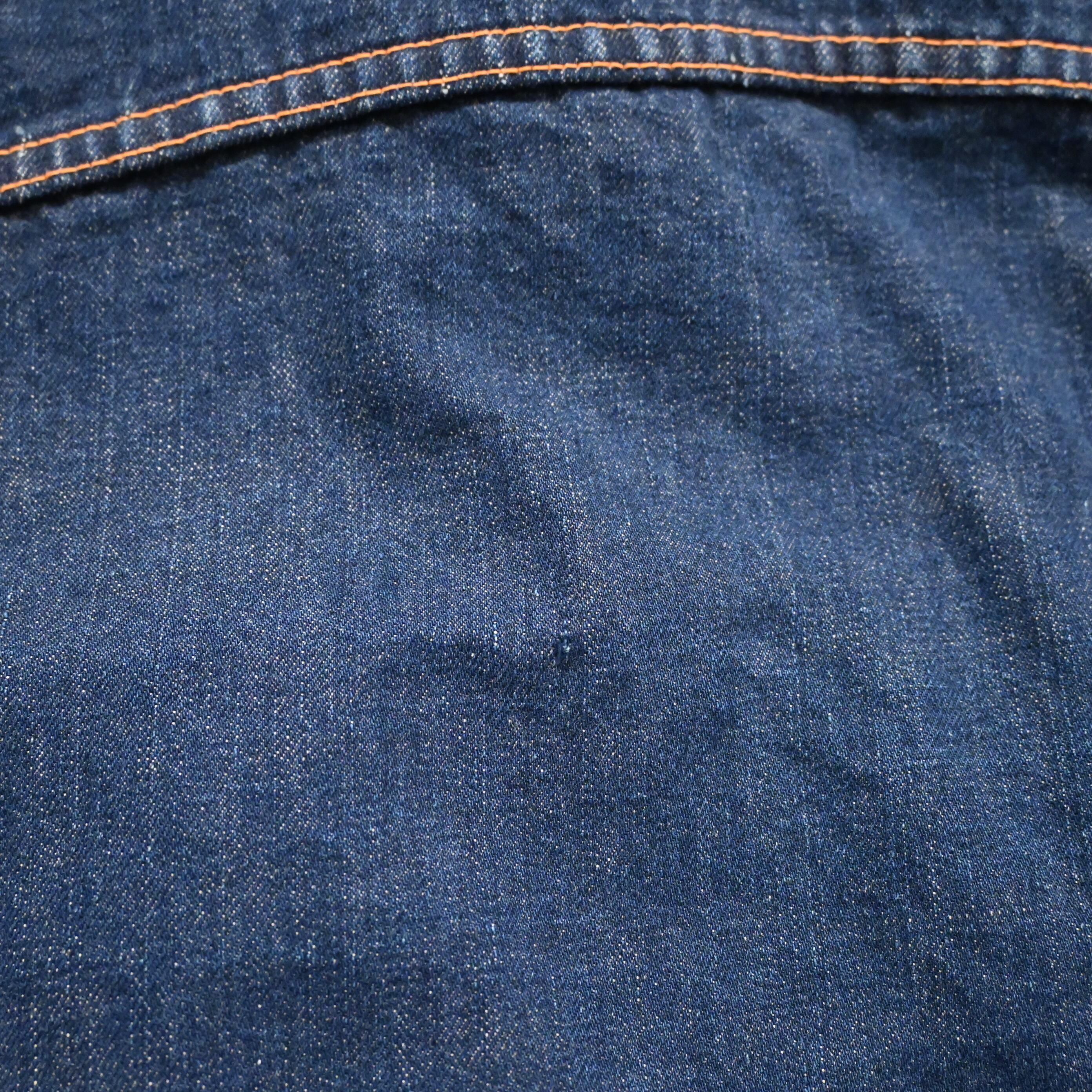 状態:インディゴが濃いので目立ちませんがシミ汚れがございます。また、古いデニム生地特有の引っかきがございます。画像にてご確認ください。