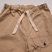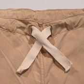 ウエストの平紐のドローコードの仕様と、太いストレートのシルエットはかなりデザイン性が高いです。生地感も薄く、夏を含め通年着用していただけます。